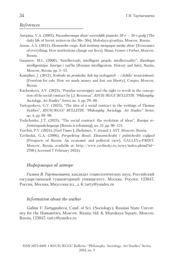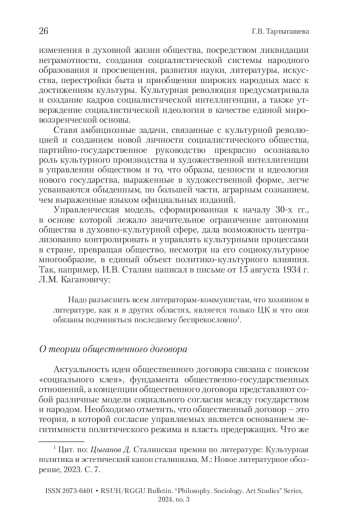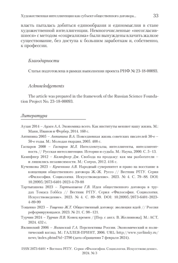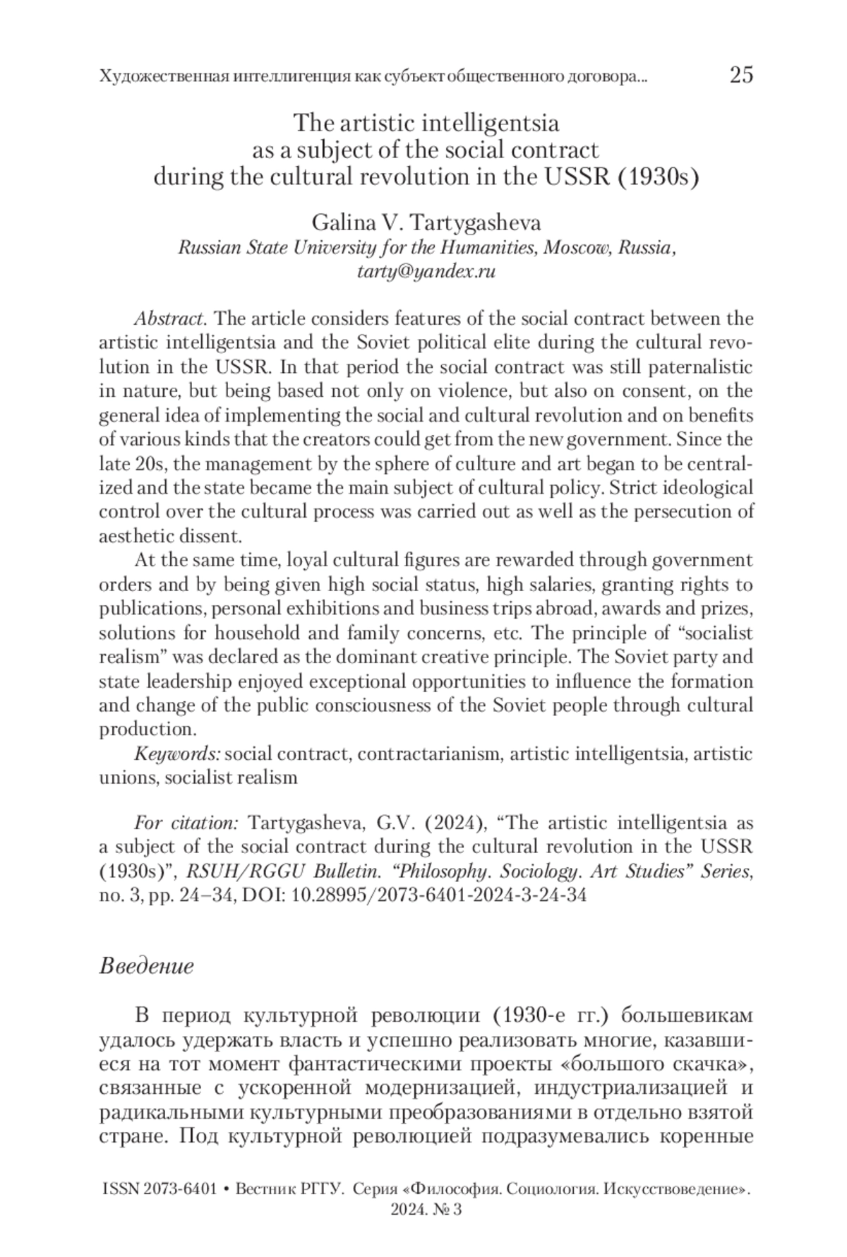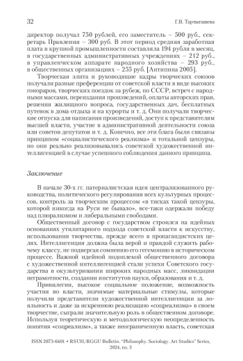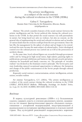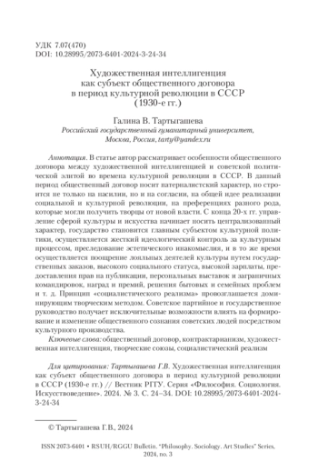 ТАРТЫГАШЕВА Г. В. ХУДОЖЕСТВЕННАЯ ИНТЕЛЛИГЕНЦИЯ КАК СУБЪЕКТ ОБЩЕСТВЕННОГО ДОГОВОРА В ПЕРИОД КУЛЬТУРНОЙ РЕВОЛЮЦИИ В СССР (1930-Е ГГ.) // ВЕСТНИК РГГУ. СЕРИЯ: ФИЛОСОФИЯ. СОЦИОЛОГИЯ. ИСКУССТВОВЕДЕНИЕ. 2024. № 3