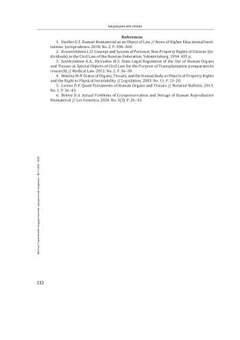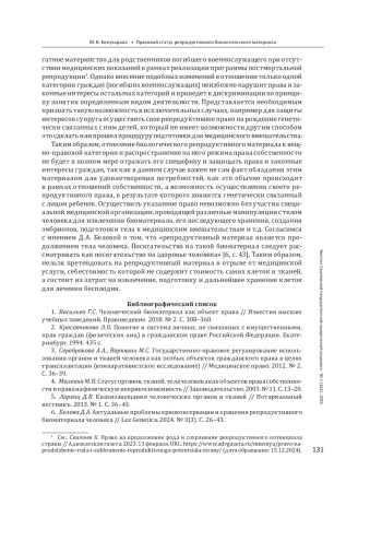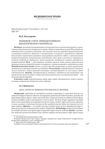 БЕКУЗАРОВА Ю. В. ПРАВОВОЙ СТАТУС РЕПРОДУКТИВНОГО БИОЛОГИЧЕСКОГО МАТЕРИАЛА // ВЕСТНИК САРАТОВСКОЙ ГОСУДАРСТВЕННОЙ ЮРИДИЧЕСКОЙ АКАДЕМИИ. 2025. № 1 (162)