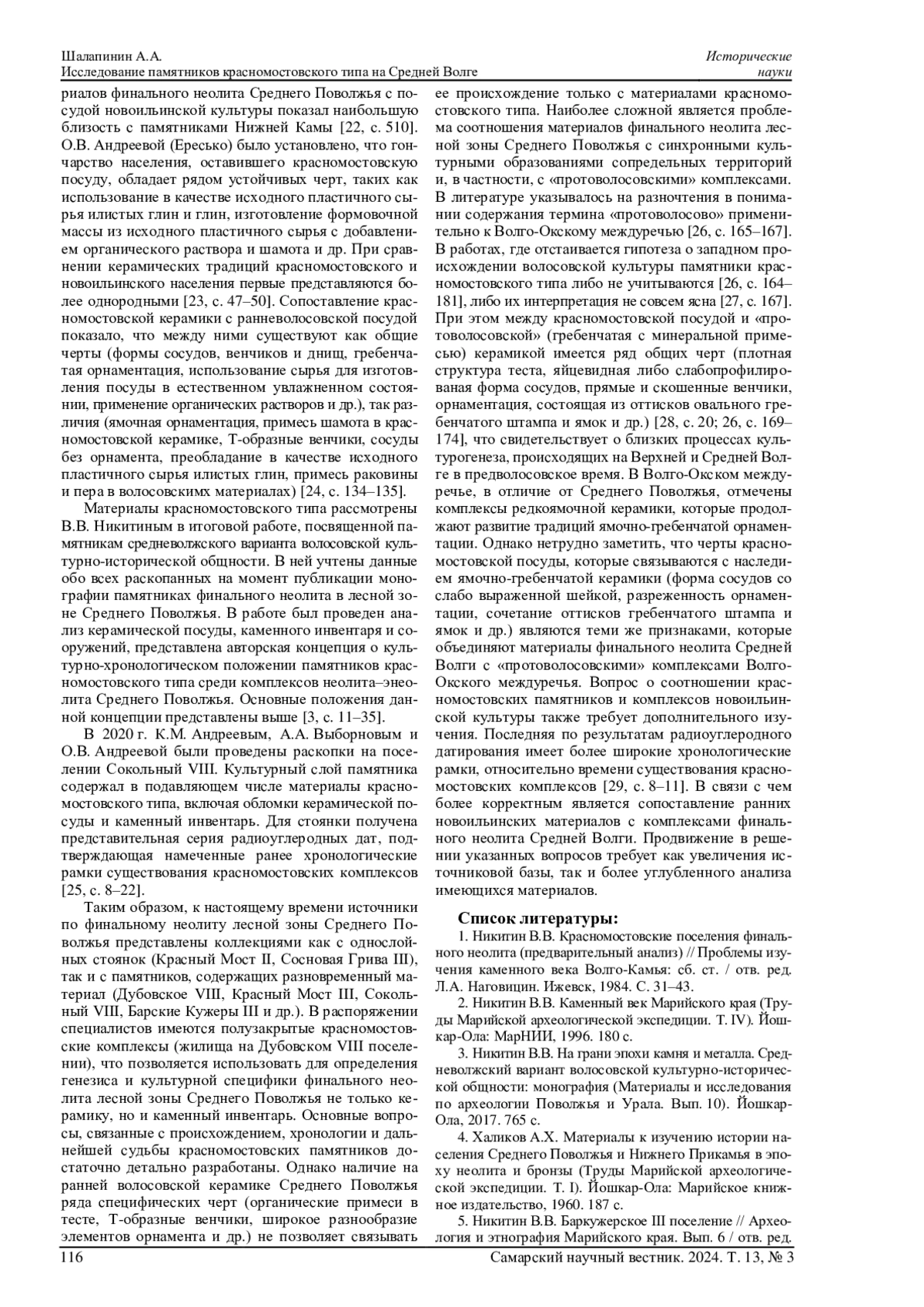 ШАЛАПИНИН А. А. ИССЛЕДОВАНИЕ ПАМЯТНИКОВ КРАСНОМОСТОВСКОГО ТИПА НА СРЕДНЕЙ ВОЛГЕ // САМАРСКИЙ НАУЧНЫЙ ВЕСТНИК. 2024. ТОМ 13, № 3