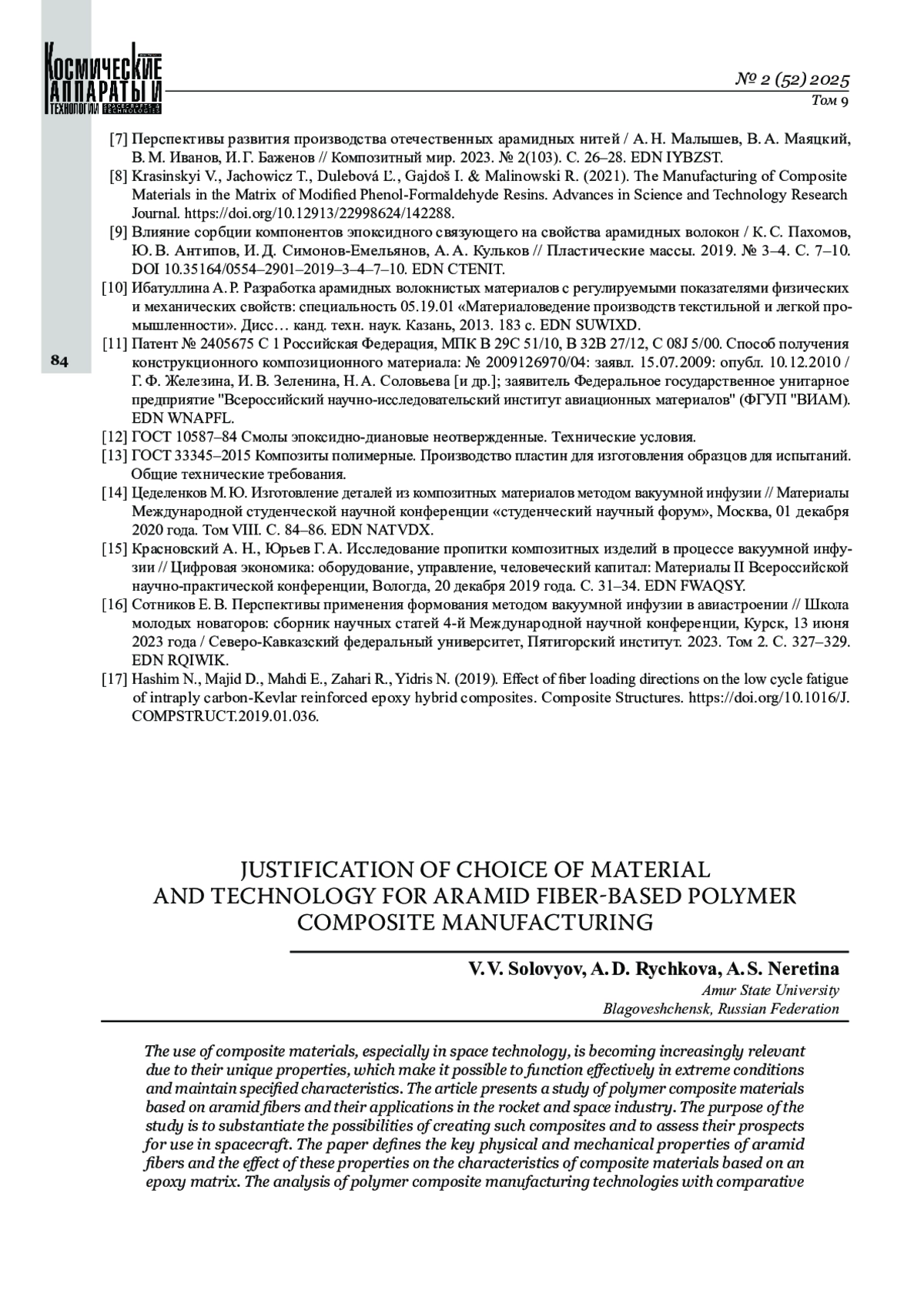 [3] Власенко А. В., Скрябин В. В. Применения перспективных композиционных материалов для проектов ракетно-космической техники // Актуальные проблемы авиации и космонавтики. 2016. Т. 1, № 12. С. 71–73. EDN WTNQDV.