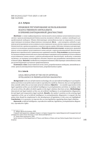 Методологическая основа: теоретико-правовой анализ использования искусственного интеллекта в преимплантационной диагностике, формально-юридический и сравнительно-правовой методы.