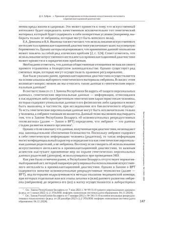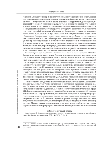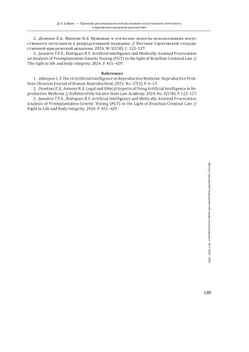 2. Демкина Е.А., Иванова Н. А. Правовые и этические аспекты использования искусственного интеллекта в репродуктивной медицине // Вестник Саратовской государственной юридической академии. 2024. № 3(158). С. 122-127.