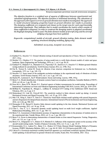 [18] Лакиза П. А. Коррекция расчетных моделей летательных аппаратов по результатам модальных испытаний: дисс. … канд. техн. наук: 2.5.14. Новосибирский государственный технический университет, Новосибирск, 2023. 162 с.