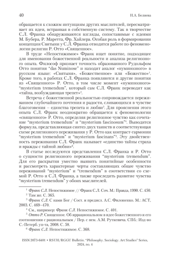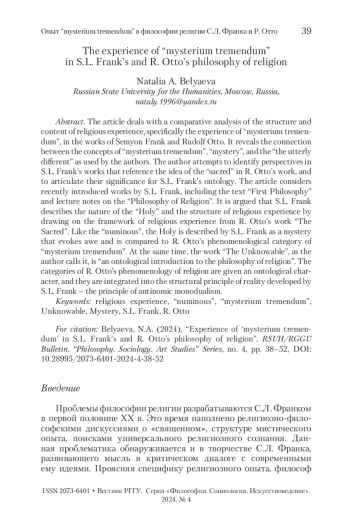 Статья посвящена сравнительному анализу структуры и содержания религиозного опыта как опыта “mysterium tremendum” у Семена Франка и Рудольфа Отто. Выявляется связь используемых авторами понятий “mysterium tremendum”, «тайна», «совершенно иное». Предпринимается попытка обнаружить в работах С. Л. Франка взгляды, отсылающие к идее «священного» у Р. Отто, сформулировать их значение для онтологии С. Л. Франка. В статье рассматриваются работы С. Л. Франка, недавно введенные в научный оборот: текст «Первая философия» и конспекты лекций «Философия религии». Автором статьи утверждается, что в «Непостижимом» С. Л. Франк описывает характер Святыни и структуру религиозного опыта, прибегая к схеме религиозного переживания из работы «Священное» Р. Отто. Подобно «нуминозному», Святыня описывается С. Л. Франком как тайна, возбуждающая трепет, и сравнивается с категорией феноменологии Р. Отто “mysterium tremendum”. При этом труд «Непостижимое», как его называет сам автор, – «опыт онтологического введения в философию религии». Категориям феноменологии религии Р. Отто придается онтологический характер, они встраиваются в разработанный С. Л. Франком структурный принцип реальности – принцип антиномистического монодуализма.