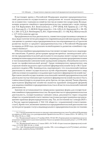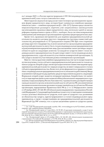 В настоящее время в Российской Федерации ведение предпринимательской деятельности осуществляется гражданами не только индивидуально, но и совместно с членами их семей (в том числе совместно супругами). Исследованием вопросов семейного предпринимательства занимались такие ученые, как Т. В. Варкулевич, В. А. Белоглазова [1, с. 2797–2814], И. В. Ершова [2, с. 67–75], А. С. Киселев [3, с. 9–20] М. В. Короткова [4, с. 116–125], А. Н. Левушкин [5, с. 90–99; 6, с. 206–217], Д. А. Пономарев [7], Ю. С. Харитонова [8, с. 11–18], М. Д. Шапсугова [9, с. 117–121] и многие другие.