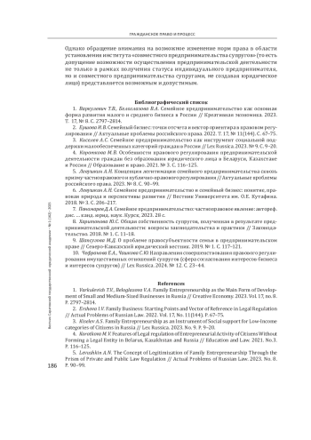 10. Чефранова Е.А., Чашкова С. Ю. Направления совершенствования правового регулирования имущественных отношений супругов (сфера согласования интересов бизнеса и интересов супругов) // Lex Russica. 2024. № 12. С. 23-44.