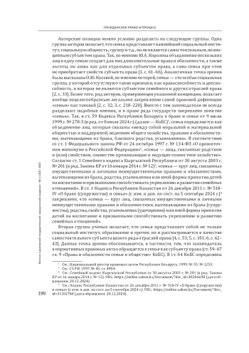 Результаты: обоснована авторская концепция с точки зрения доктринальных подходов и контента законодательства относительно проблем правосубъектности семьи, правовых гарантий лиц с семейными обязанностями. Проведен сравнительно-правовой анализ указанных категорий, в том числе с позиций норм международного права.