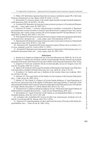Выводы: семья не является самостоятельным субъектом права, в качестве таковых выступают отдельные ее члены. Высказана идея о возможном совершенствовании (систематизации) понятийного аппарата и расширении перечня субъектов, пользующихся соответствующими льготами, закреплении дефиниции лиц с семейными обязанностями.