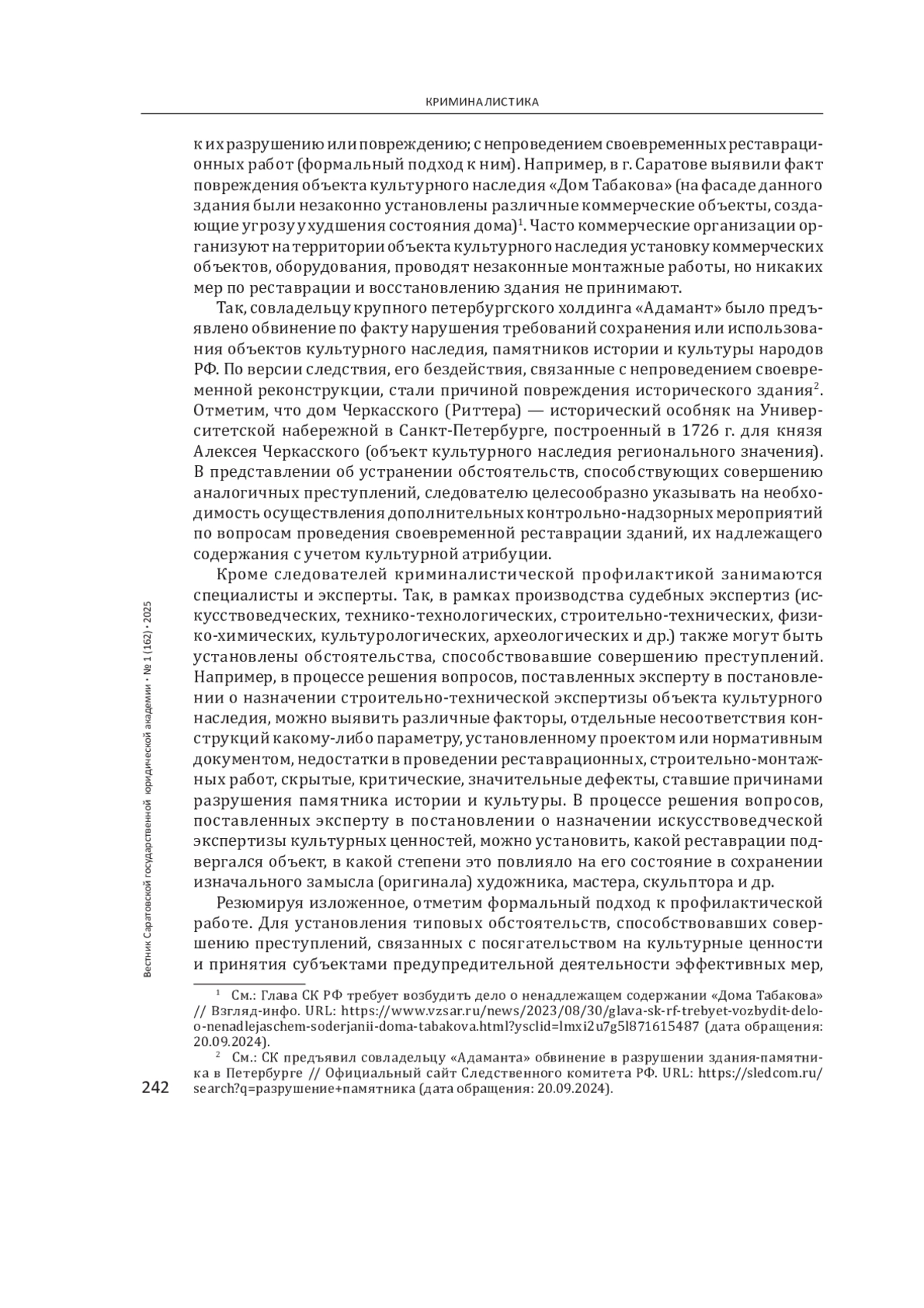 Выводы: в профилактической работе контролирующим и правоохранительным органам при согласованном взаимодействии необходимо анализировать обстоятельства, связанные с деструктивными факторами личности преступника и его поведением, с организацией контрольно-надзорной деятельности в сфере сохранения культурного наследия, в целях повышения качества профилактической работы при составлении представления об устранении обстоятельств, способствовавших совершению преступлений, связанных с посягательством на культурные ценности, следует учитывать сформулированные в статье критерии.