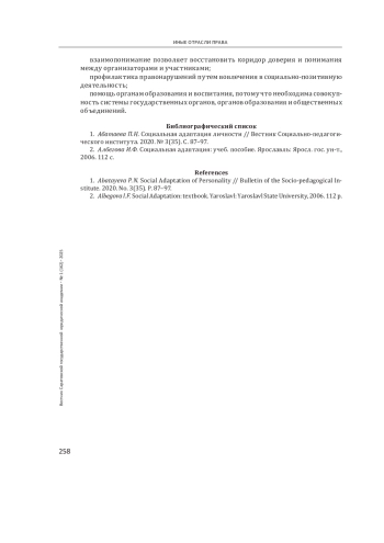 1. Абатаева П. Н. Социальная адаптация личности // Вестник Социально-педагогического института. 2020. № 3(35). С. 87-97. EDN: USGENZ