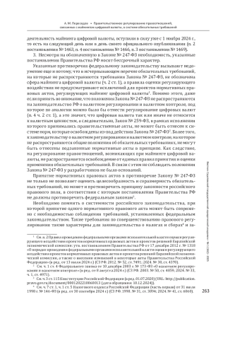 Введение: актуальность темы исследования обусловлена проведенной в 2024 г. реформой, направленной на регулирование оборота цифровой валюты, в том числе ее майнинга. Данное регулирование сопровождалось введением новых обязательных требований, предъявляемых к деятельности хозяйствующих субъектов. Цель - изучить, насколько обязательные требования в области майнинга цифровой валюты соответствуют порядку их разработки и принятия, который установлен в Федеральном законе от 31 июля 2020 г. № 247-ФЗ «Об обязательных требованиях в Российской Федерации».