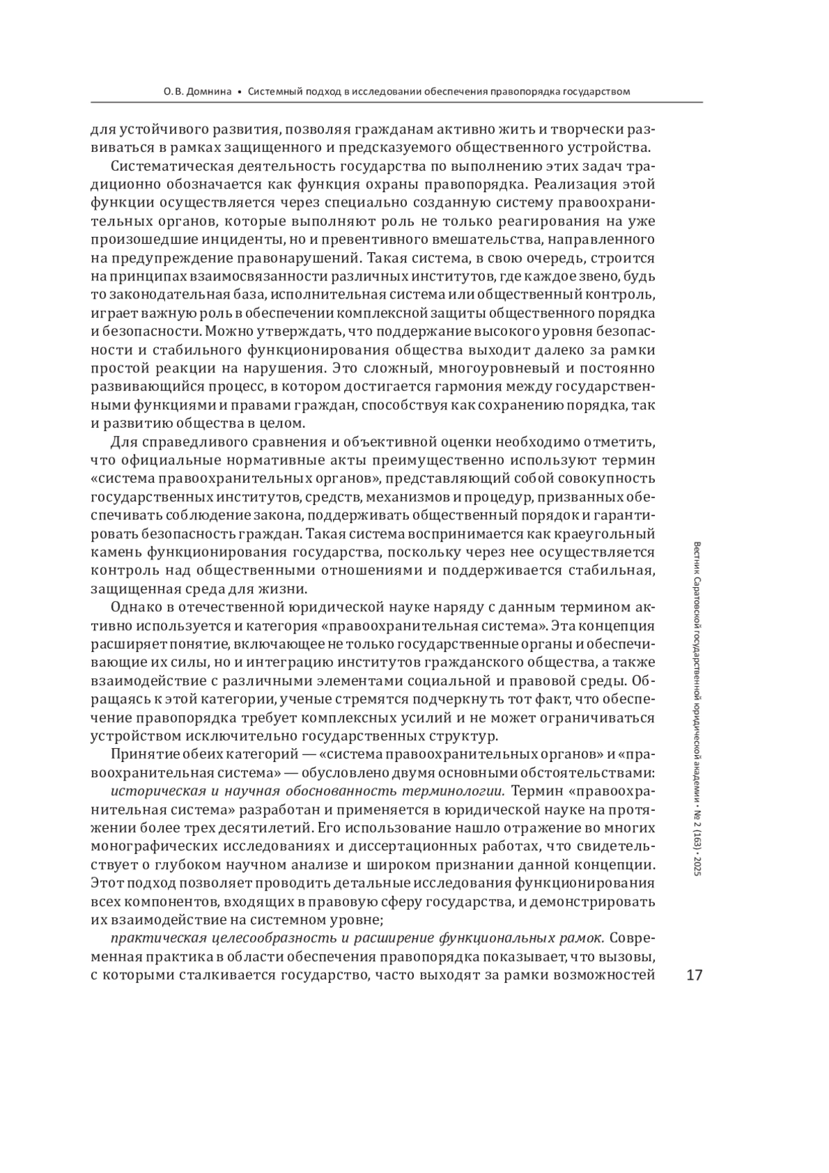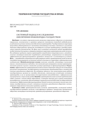 Введение: в условиях стремительного развития современных обществ и усложнения социальных, политических и правовых процессов становится очевидной необходимость углубленного изучения механизмов обеспечения правопорядка. Государственные структуры вынуждены адаптироваться к постоянно возникающим вызовам, связанным с усилением динамики общественных процессов, выходящими за рамки традиционных способов управления угрозами безопасности. На фоне этих изменений системный подход приобретает особое значение для оценки и совершенствования структуры правоохранительной системы. Исследование проблемы охраны правопорядка посредством концептуальных и методологических инноваций позволяет выработать рекомендации, направленные на повышение эффективности функционирования правового механизма в изменяющихся условиях. Цель - разработать концептуально обоснованную модель правоохранительной системы, способную интегрировать системный подход в изучение ее структуры и функциональных особенностей.