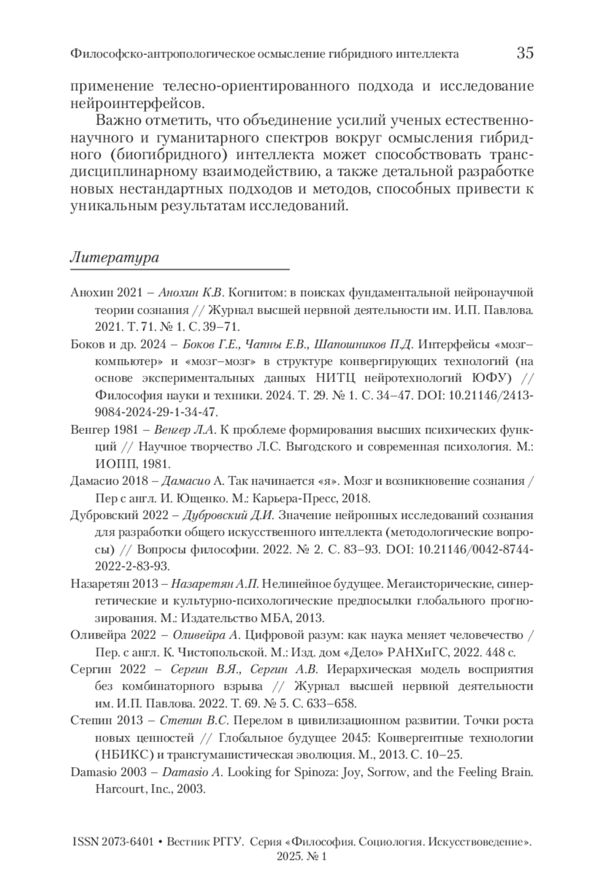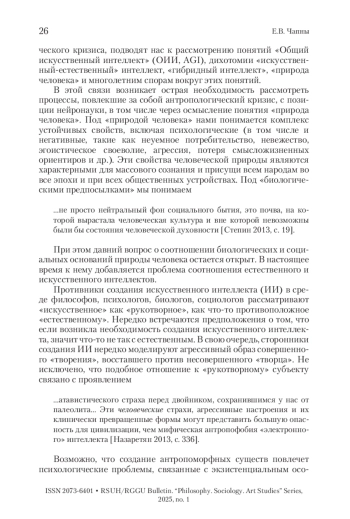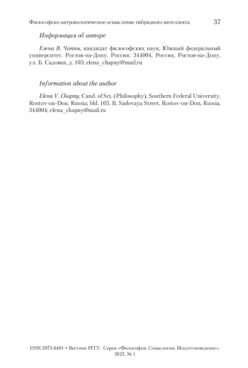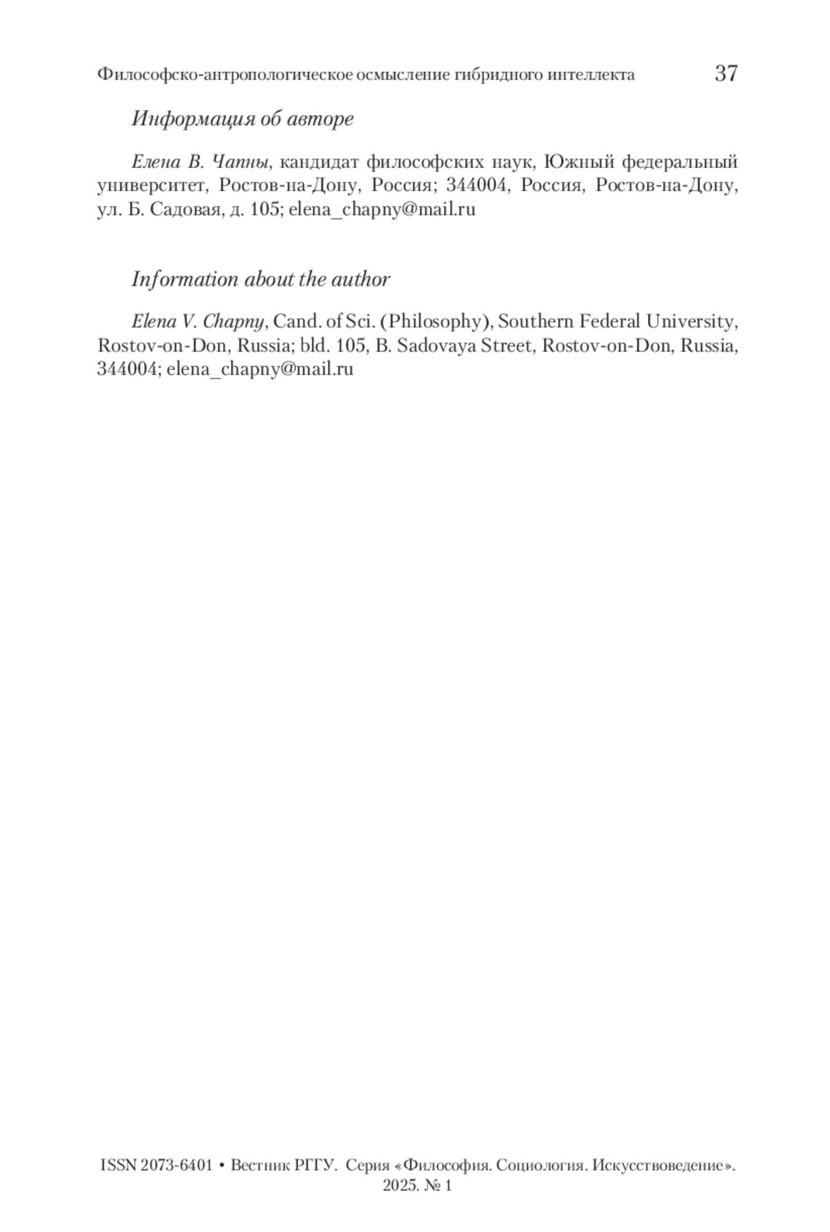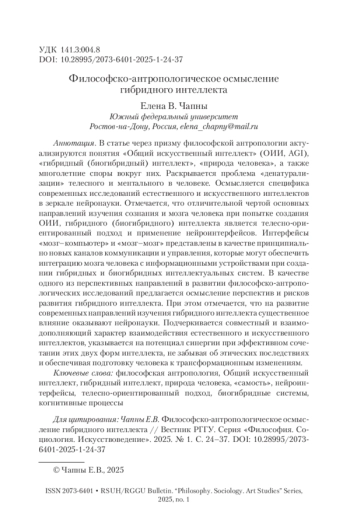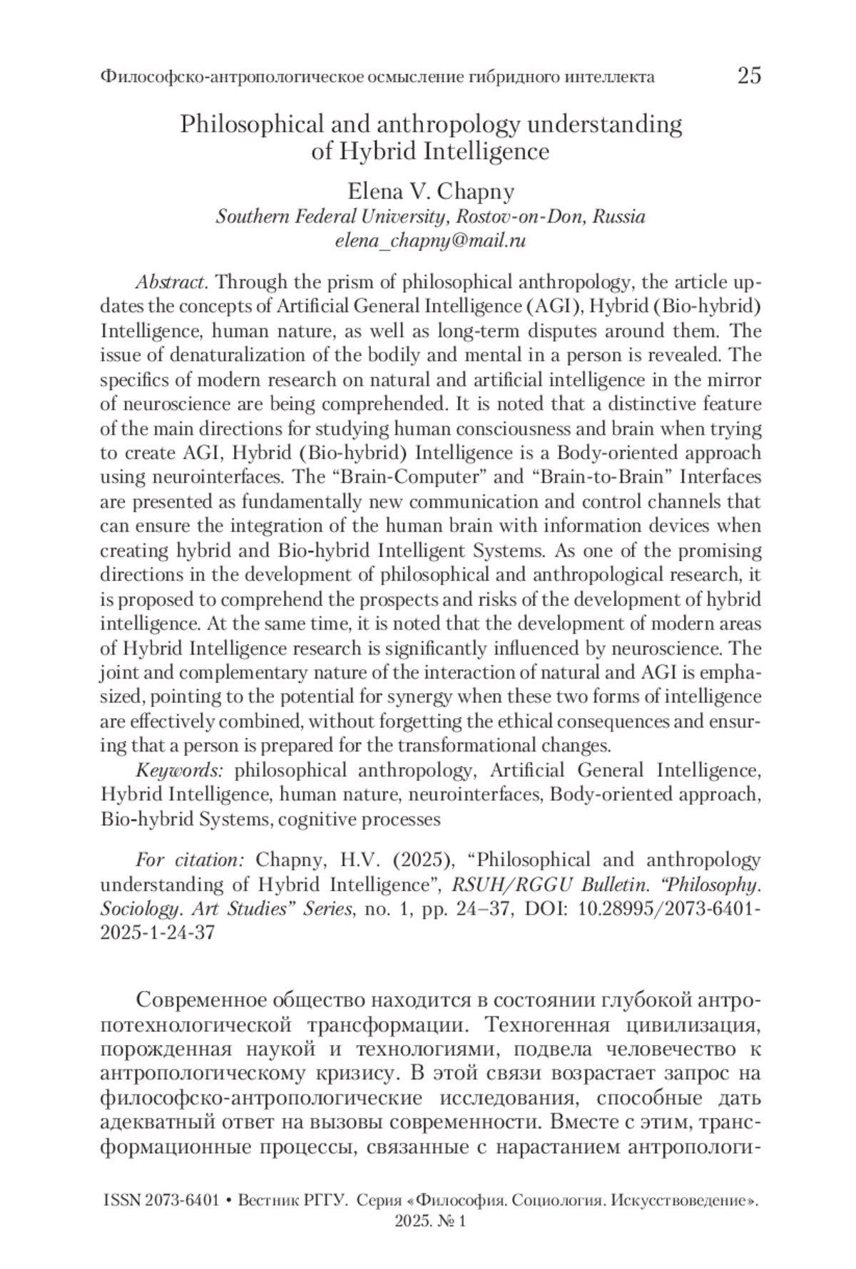 ЧАПНЫ Е. В. ФИЛОСОФСКО-АНТРОПОЛОГИЧЕСКОЕ ОСМЫСЛЕНИЕ ГИБРИДНОГО ИНТЕЛЛЕКТА // ВЕСТНИК РГГУ. СЕРИЯ: ФИЛОСОФИЯ. СОЦИОЛОГИЯ. ИСКУССТВОВЕДЕНИЕ. 2025. № 1