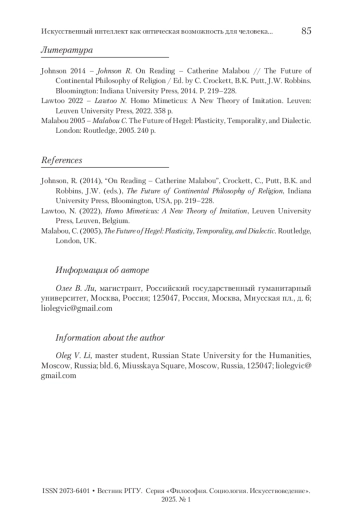 В «Феноменологии Духа» Гегель описывает акт боговоплощения как онтическую возможность для Бога и онтологическую возможность для человека. Совершенный, но непредставимый Бог приходит к падшему человечеству в форме Иисуса Христа, человека, воплотившего Собою совершенство Бога. Катарина Малабу называет такую встречу пластичной. Пластичность – это не упругость резины, которая знает свою форму и стремится к ней вернуться, и не способность пластика заполнять стальную заготовку и застывать в ней. Пластичность – это свойство глины принимать форму в руках горшечника, оставаясь глиной. Используя понятие пластичности, мы попробуем описать такую встречу человека с ИИ, в которой человек меняется местами с Богом и предстает лицом к лицу как творец перед своим творением, идеальной формой человеческого интеллекта – интеллектом искусственным. Мы покажем, почему ожидание этой встречи сопровождается и предвкушением, и тревогой человечества. ИИ ищет идеальную форму, и человек пока не готов ее признать.