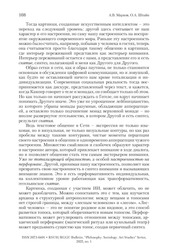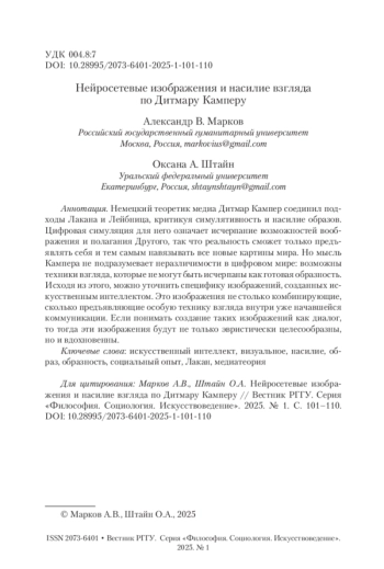 Немецкий теоретик медиа Дитмар Кампер соединил подходы Лакана и Лейбница, критикуя симулятивность и насилие образов. Цифровая симуляция для него означает исчерпание возможностей воображения и полагания Другого, так что реальность сможет только предъявлять себя и тем самым навязывать все новые картины мира. Но мысль Кампера не подразумевает неразличимости в цифровом мире: возможны техники взгляда, которые не могут быть исчерпаны как готовая образность. Исходя из этого, можно уточнить специфику изображений, созданных искусственным интеллектом. Это изображения не столько комбинирующие, сколько предъявляющие особую технику взгляда внутри уже начавшейся коммуникации. Если понимать создание таких изображений как диалог, то тогда эти изображения будут не только эвристически целесообразны, но и вдохновенны.