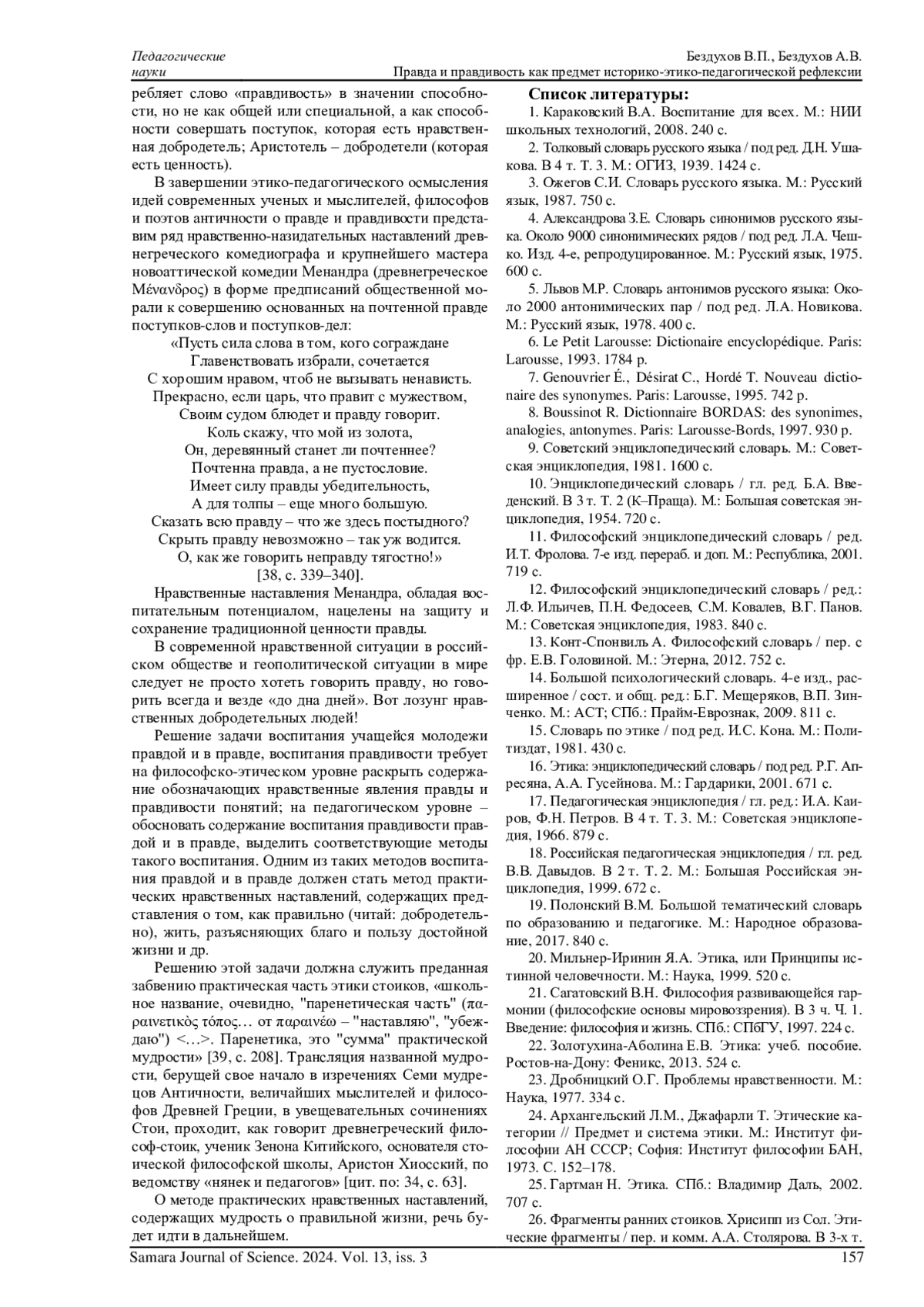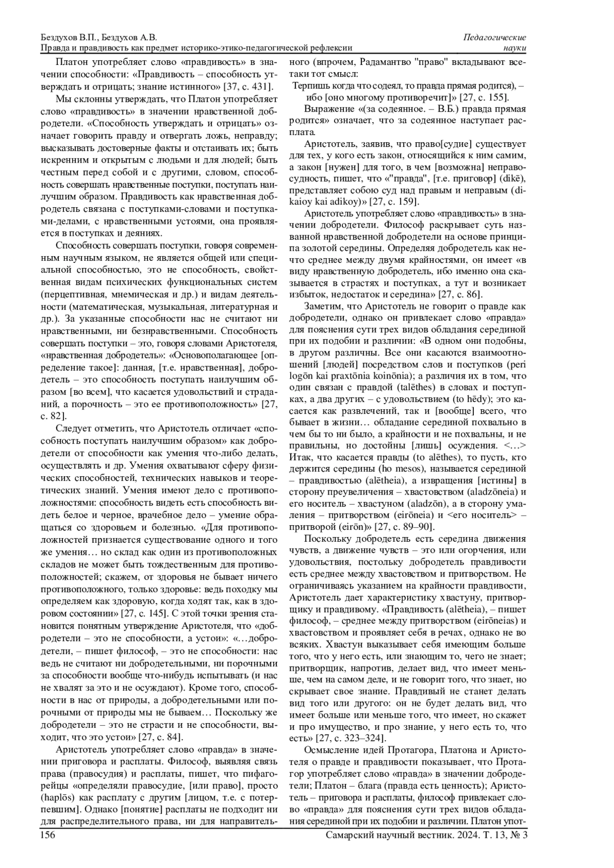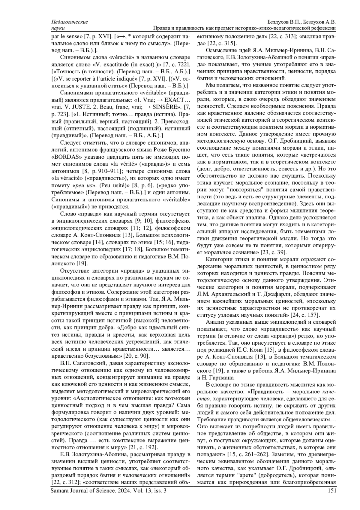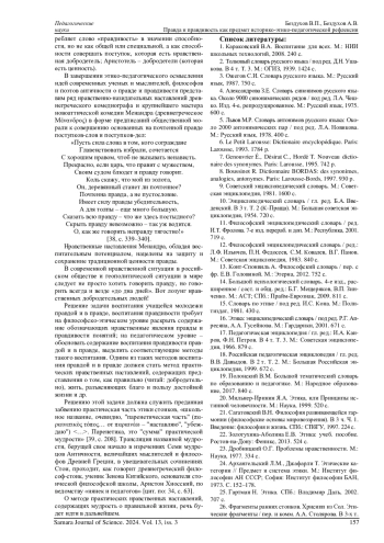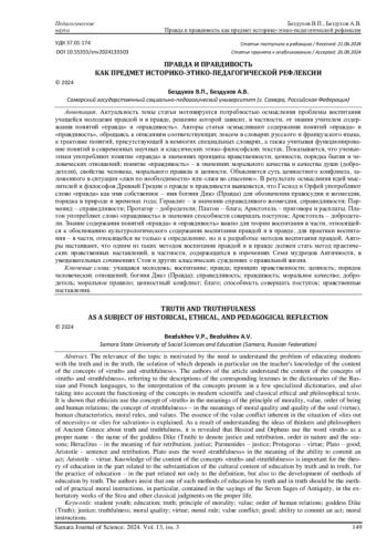 БЕЗДУХОВ В. П., БЕЗДУХОВ А. В. ПРАВДА И ПРАВДИВОСТЬ КАК ПРЕДМЕТ ИСТОРИКО-ЭТИКО-ПЕДАГОГИЧЕСКОЙ РЕФЛЕКСИИ // САМАРСКИЙ НАУЧНЫЙ ВЕСТНИК. 2024. ТОМ 13, № 3