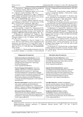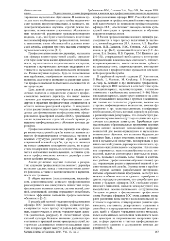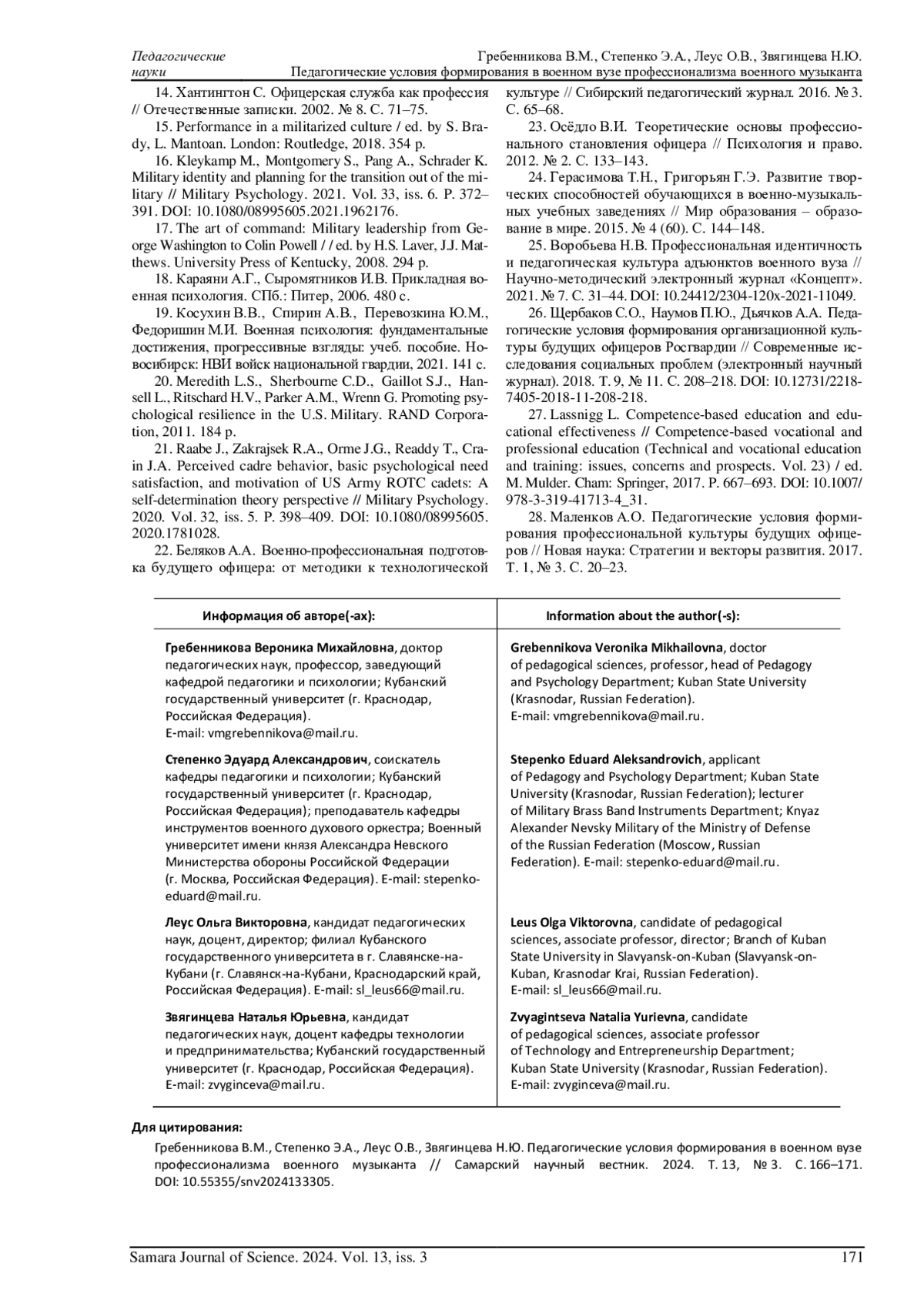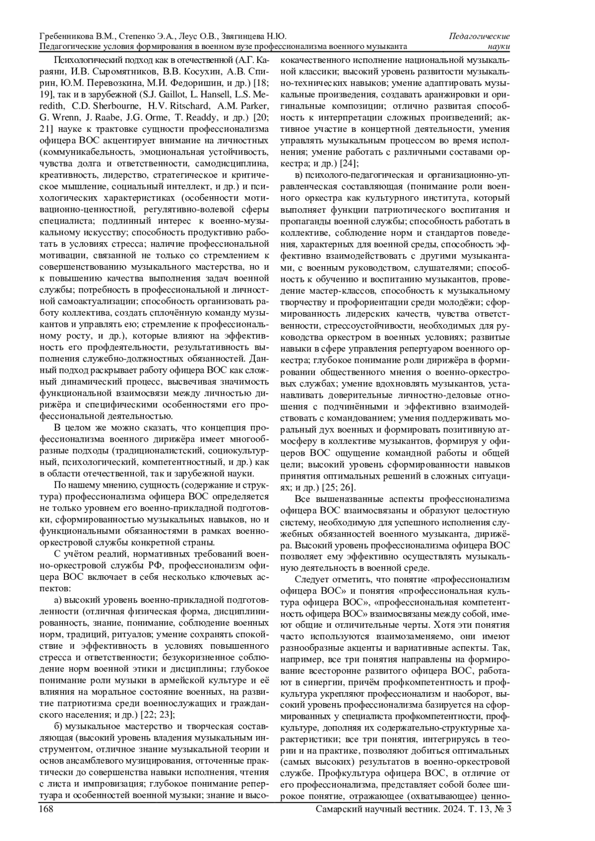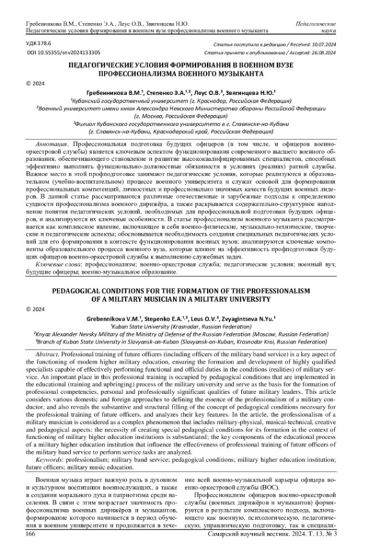 ГРЕБЕННИКОВА В. М., СТЕПЕНКО Э. А., ЛЕУС О. В., ЗВЯГИНЦЕВА Н. Ю. ПЕДАГОГИЧЕСКИЕ УСЛОВИЯ ФОРМИРОВАНИЯ В ВОЕННОМ ВУЗЕ ПРОФЕССИОНАЛИЗМА ВОЕННОГО МУЗЫКАНТА // САМАРСКИЙ НАУЧНЫЙ ВЕСТНИК. 2024. ТОМ 13, № 3