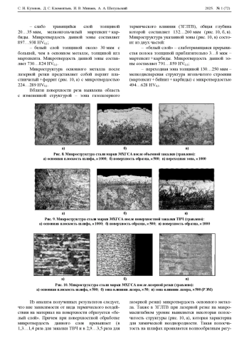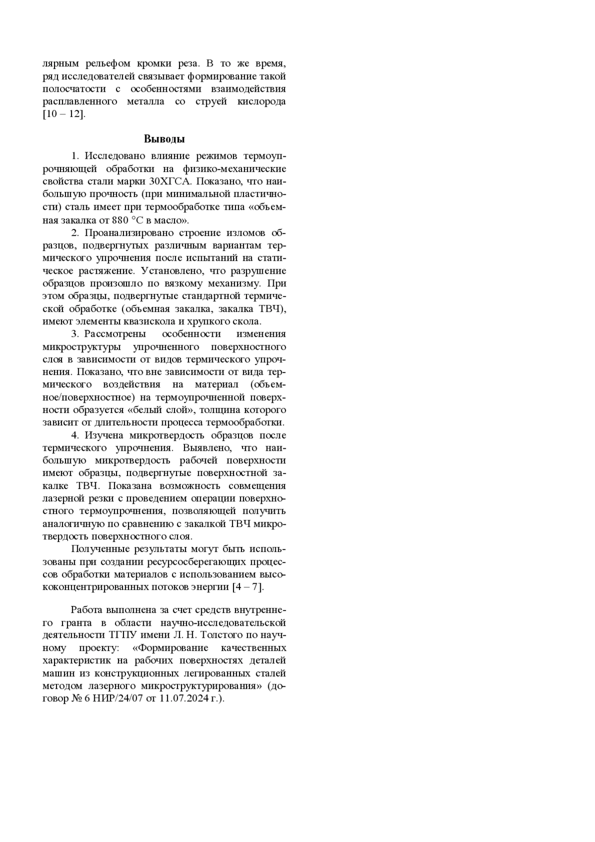 9. Влияние режимов лазерной обработки на изменение структуры и механических свойств поверхностного слоя деталей из стали марки 30ХГСА / И. В. Минаев, С. Н. Кутепов, Д. С. Клементьев, Е. В. Агеев // Известия Юго-Западного государственного университета. Серия: Техника и технологии. - 2023. - Т. 13. - № 1. - С. 73 - 86. DOI: 10.21869/2223-1528-2023-13-1-73-86 EDN: XQXLLM