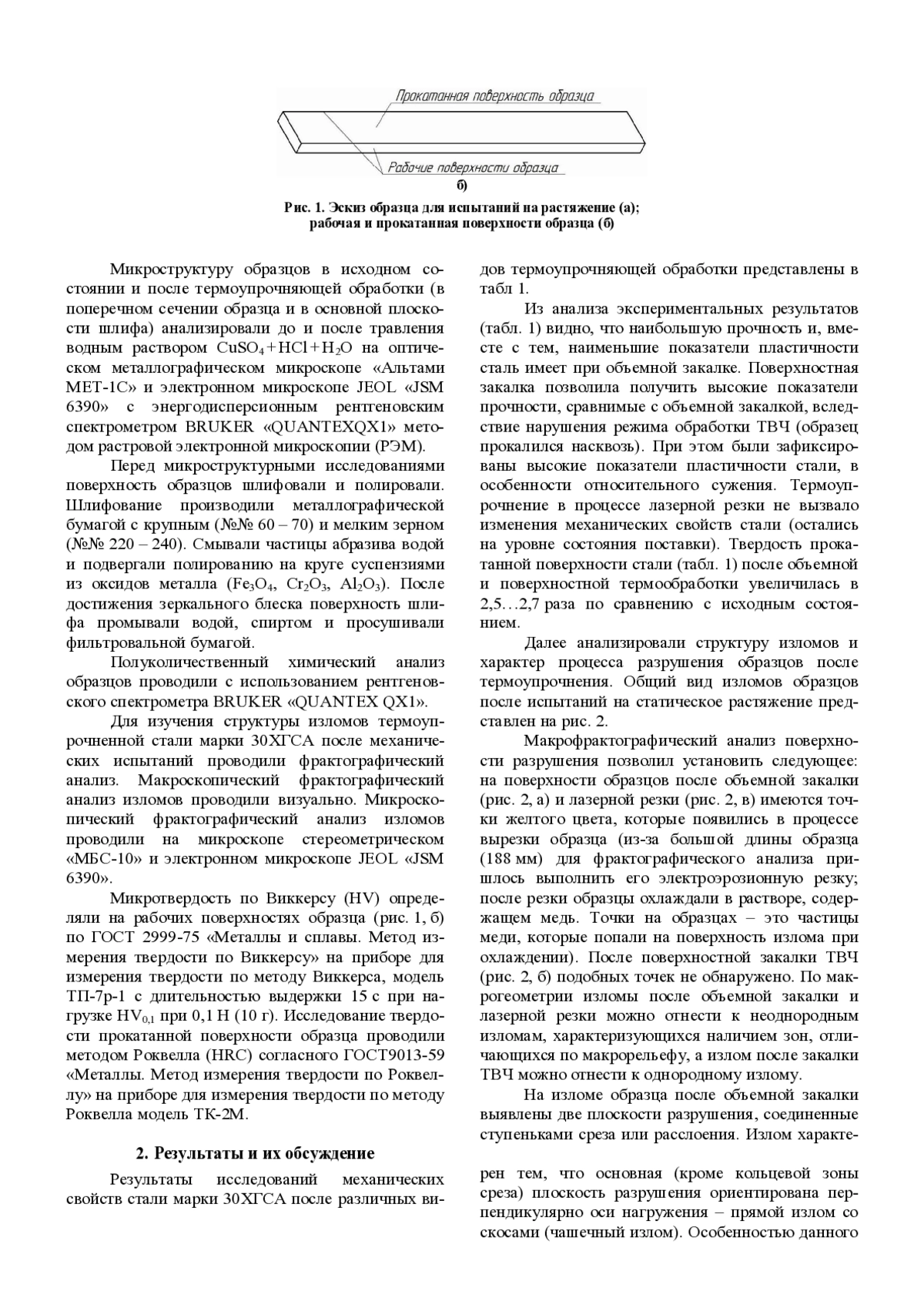 В работе приводятся результаты исследования влияния методов термического упрочнения (объемная закалка, поверхностная закалка ТВЧ, термоупрочнение в процессе лазерной резки) на изменение физико-механических свойств, структуру и особенности процесса разрушения горячекатаной конструкционной среднелегированной стали марки 30ХГСА. Показано, что наибольшую прочность (при минимальной пластичности) сталь имеет при термообработке типа «объемная закалка от 880 °С в масло». Проанализировано строение изломов образцов, подвергнутых различным вариантам термического упрочнения после испытаний на статическое растяжение. Установлено, что разрушение образцов произошло по вязкому механизму. При этом образцы, подвергнутые стандартной термической обработке (объемная закалка, закалка ТВЧ) имеют элементы квазискола и хрупкого скола. Изучена микротвердость образцов после термического упрочнения. Выявлено, что наибольшую микротвердость рабочей поверхности имеют образцы, подвергнутые поверхностной закалке ТВЧ. Использование лазерной резки позволяет получить аналогичную по сравнению с закалкой ТВЧ микротвердость поверхностного слоя.