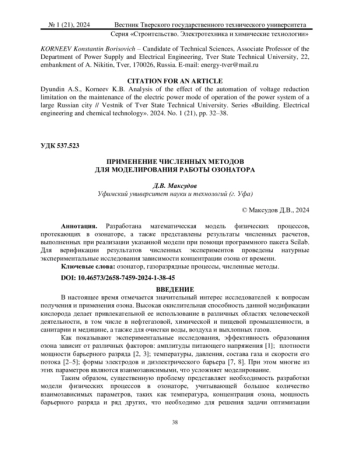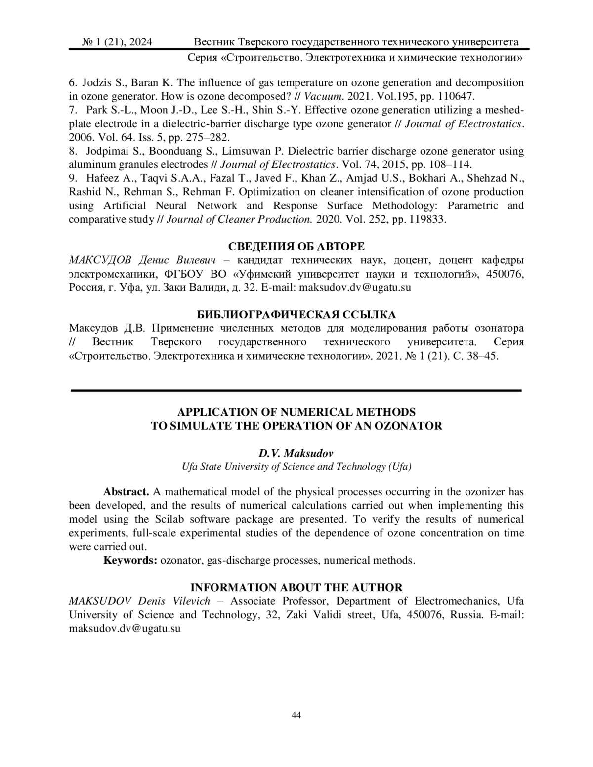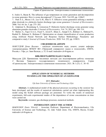 2. Jodzis S., Zięba M. Energy efficiency of an ozone generation process in oxygen. Analysis of a pulsed DBD system // Vacuum. 2018. Vol. 155, рр. 29-37. EDN: SGNCEL