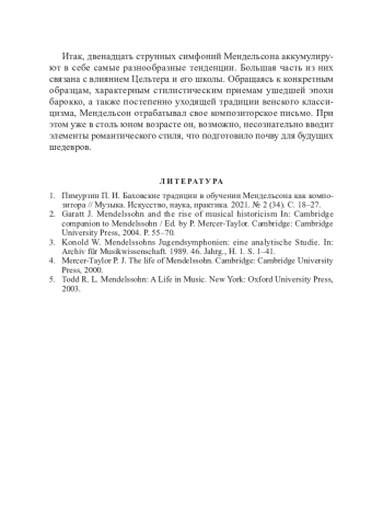 1. Пимурзин П. И. Баховские традиции в обучении Мендельсона как композитора // Музыка. Искусство, наука, практика. 2021. № 2 (34). С. 18–27.