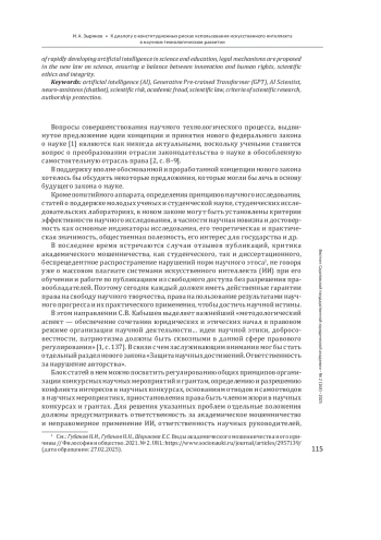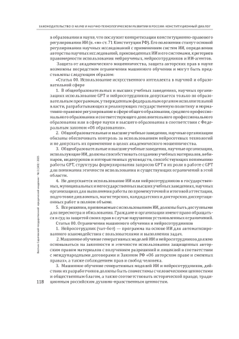 Выводы: в связи с необходимостью этического регулирования использования быстроразвивающегося искусственного интеллекта в науке и образовании предложены правовые механизмы в новый закон о науке, обеспечивающие баланс между инновациями и правами человека, научной этикой и добросовестностью.