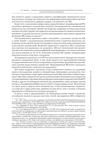 Введение: инициированный в литературе С. В. Кабышевым диалог о совершенствовании законодательства о науке, построенный на идее научной этики, добросовестности, патриотизма, требует разработки нового подхода к правовому регулированию, который должен учитывать как научные риски, так и возможности, связанные с искусственным интеллектом. Цель - проанализировать влияние систем искусственного интеллекта на научный процесс, выявить риски академического мошенничества и предложить меры по совершенствованию законодательства в области научных прав.