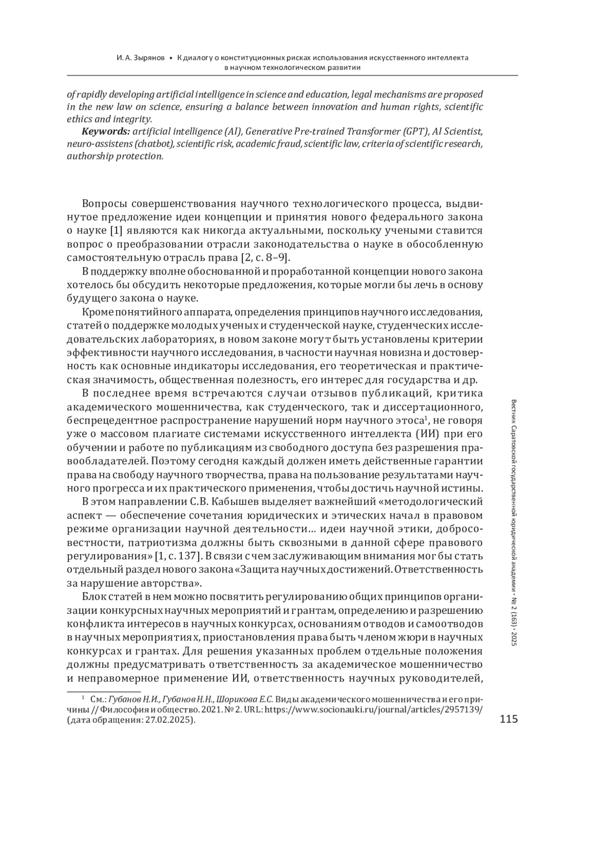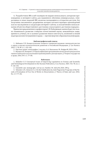 1. Кабышев С. В. Концептуальные вопросы совершенствования законодательства о науке и научно-технологическом развитии в Российской Федерации // Lex Russica. 2025. Т. 78, № 2. С. 132-142.