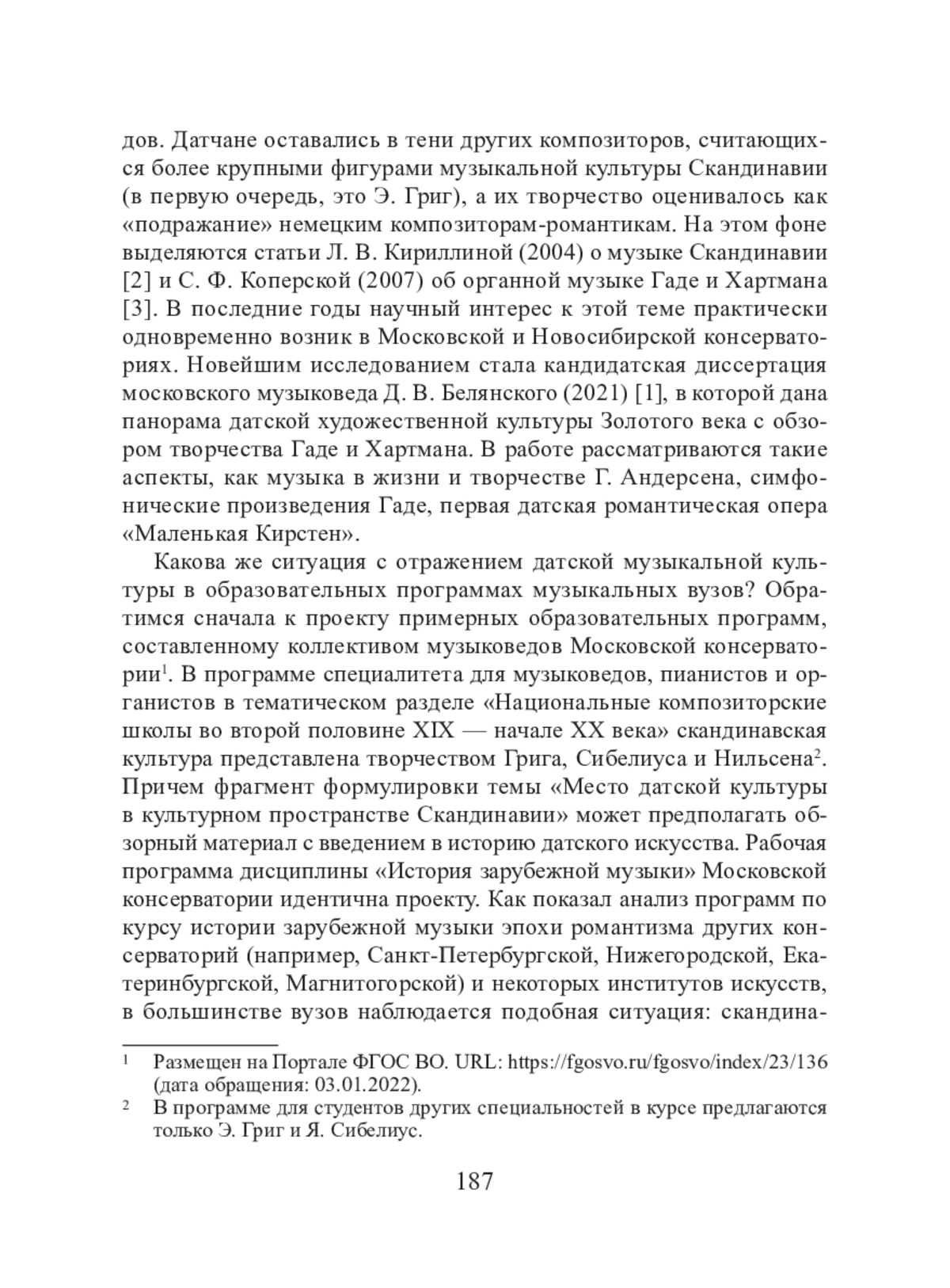 Уникальность датской музыкальной культуры во многом обусловлена географическим положением страны. Находясь на стыке двух культур — немецкой и собственно скандинавской (шведской, норвежской и финской), — музыка Дании вобрала в себя особенности обеих. Но, несмотря на такой «пограничный» статус, композиторское наследие Дании, безусловно, отличается специфическими национальными качествами. Насколько глубоко исследован богатейший пласт датского искусства в отечественной музыкальной науке и как он отражен в образовательном процессе музыкальных вузов России? Какова степень освоения музыкальной культуры Дании XIX века в курсе истории зарубежной музыки?