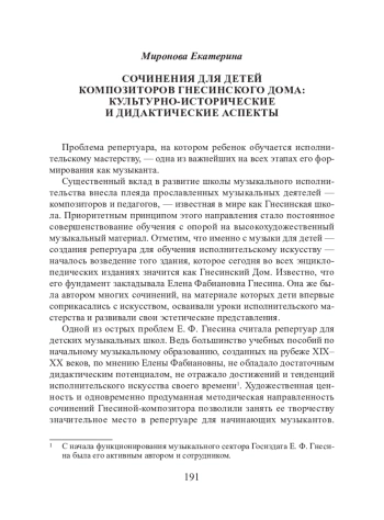 Существенный вклад в развитие школы музыкального исполнительства внесла плеяда прославленных музыкальных деятелей — композиторов и педагогов, — известная в мире как Гнесинская школа. Приоритетным принципом этого направления стало постоянное совершенствование обучения с опорой на высокохудожественный музыкальный материал. Отметим, что именно с музыки для детей — создания репертуара для обучения исполнительскому искусству — началось возведение того здания, которое сегодня во всех энциклопедических изданиях значится как Гнесинский Дом. Известно, что его фундамент закладывала Елена Фабиановна Гнесина. Она же была автором многих сочинений, на материале которых дети впервые соприкасались с искусством, осваивали уроки исполнительского мастерства и развивали свои эстетические представления.