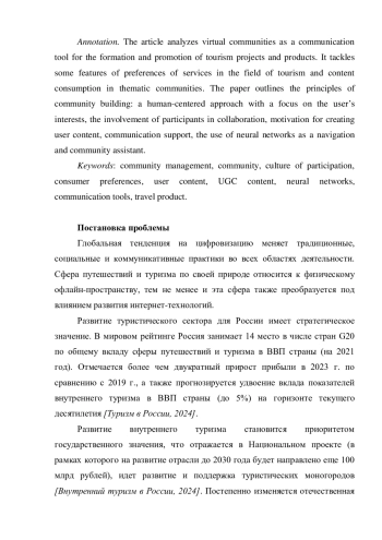 В статье анализируются виртуальные сообщества как коммуникационный инструмент формирования и продвижения туристских проектов и продуктов. Рассмотрены некоторые особенности предпочтений услуг в сфере туризма и потребления контента в тематических сообществах. Обозначены принципы построения сообщества: человекоцентированный подход с фокусом на интересы пользователя, вовлечение участников в совместную работу, мотивацию создания пользовательского контента, поддержку общения, применение нейросетей в качестве навигации и помощника сообщества.