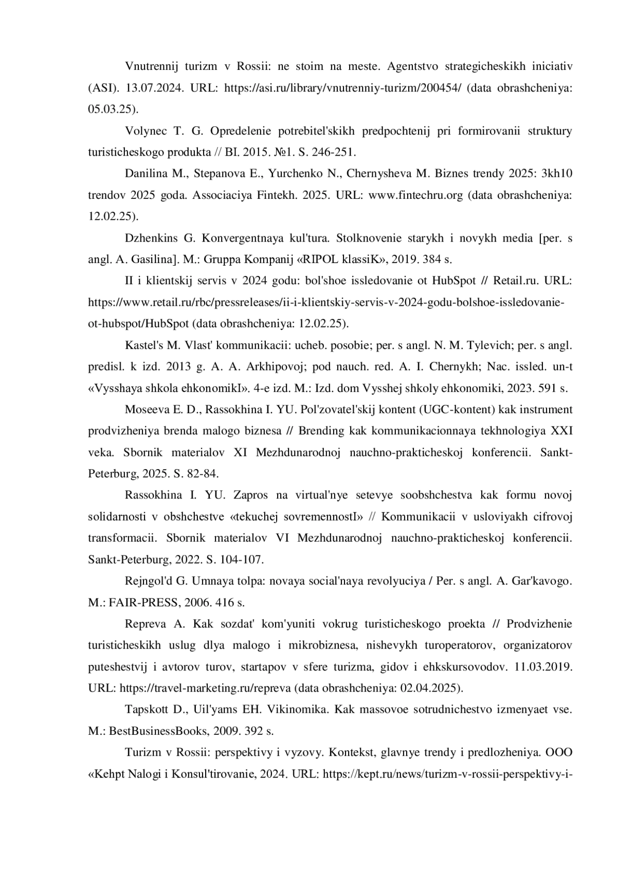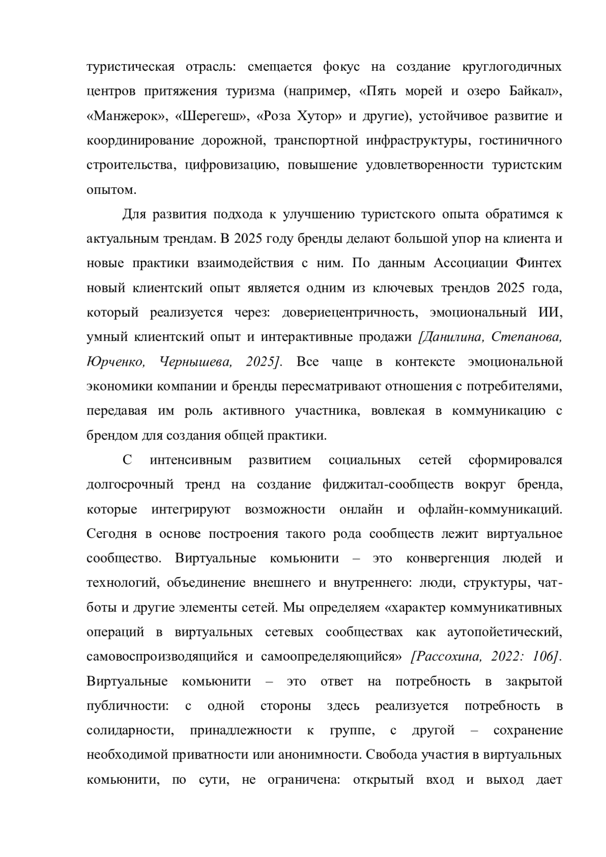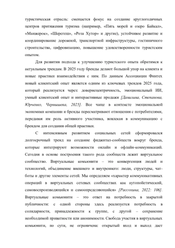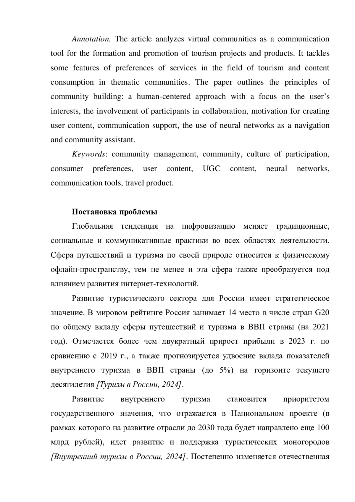 Ключевые фразы: бренд-сообщество, комьюнити-менеджмент, культура соучастия, ПОТРЕБИТЕЛЬСКИЕ ПРЕДПОЧТЕНИЯ, пользовательский контент, ugc-контент, нейросети, коммуникационные инструменты, туристский проект