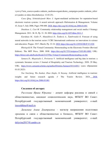 РАССОХИНА И. Ю., ДАЛЫЗИНА А. Д. ИСПОЛЬЗОВАНИЕ ВИРТУАЛЬНОГО СООБЩЕСТВА ДЛЯ СОЗДАНИЯ И ПРОДВИЖЕНИЯ ТУРИСТСКИХ ПРОЕКТОВ С ПРИМЕНЕНИЕМ НЕЙРОСЕТЕЙ // РОССИЙСКАЯ ШКОЛА СВЯЗЕЙ С ОБЩЕСТВЕННОСТЬЮ. 2025. № 37