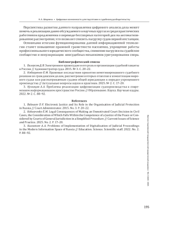 3. Кузнецов А. А. Проблемы реализации цифровизации судопроизводства в современном информационном пространстве России // Образование. Наука. Научные кадры. 2022. № 2. С. 88-92. EDN: ATCCEP