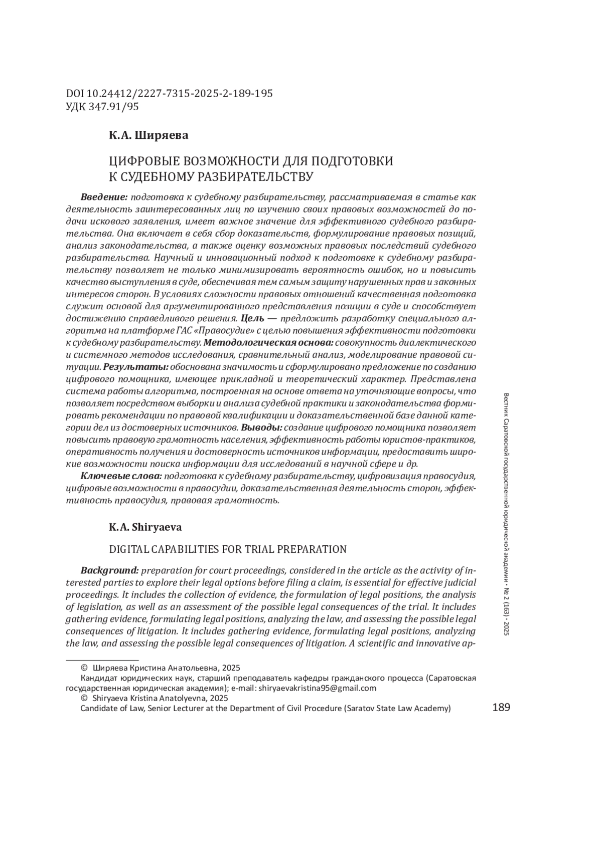 Введение: подготовка к судебному разбирательству, рассматриваемая в статье как деятельность заинтересованных лиц по изучению своих правовых возможностей до подачи искового заявления, имеет важное значение для эффективного судебного разбирательства. Она включает в себя сбор доказательств, формулирование правовых позиций, анализ законодательства, а также оценку возможных правовых последствий судебного разбирательства. Научный и инновационный подход к подготовке к судебному разбирательству позволяет не только минимизировать вероятность ошибок, но и повысить качество выступления в суде, обеспечивая тем самым защиту нарушенных прав и законных интересов сторон. В условиях сложности правовых отношений качественная подготовка служит основой для аргументированного представления позиции в суде и способствует достижению справедливого решения. Цель - предложить разработку специального алгоритма на платформе ГАС «Правосудие» с целью повышения эффективности подготовки к судебному разбирательству.