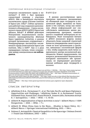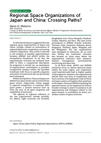 В 2013 году Судзуки Кадзуто предположил, что региональные космические организации Японии и Китая, изначально созданные в качестве дипломатических инструментов регионального противостояния, переходят к взаимодействию. Данная статья посвящена поиску возможных точек для сближения APRSAF и APSCO с точки зрения астрополитики. Для этого анализируется деятельность организаций в период с 2013 по 2023 года, проводится сравнительная характеристика программ, дается оценка характеру их взаимодействия. Ранее подобный сравнительный анализ с фокусом на конкретных программах и случаях взаимодействия в указанных временных рамках не проводился.