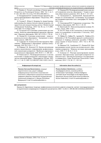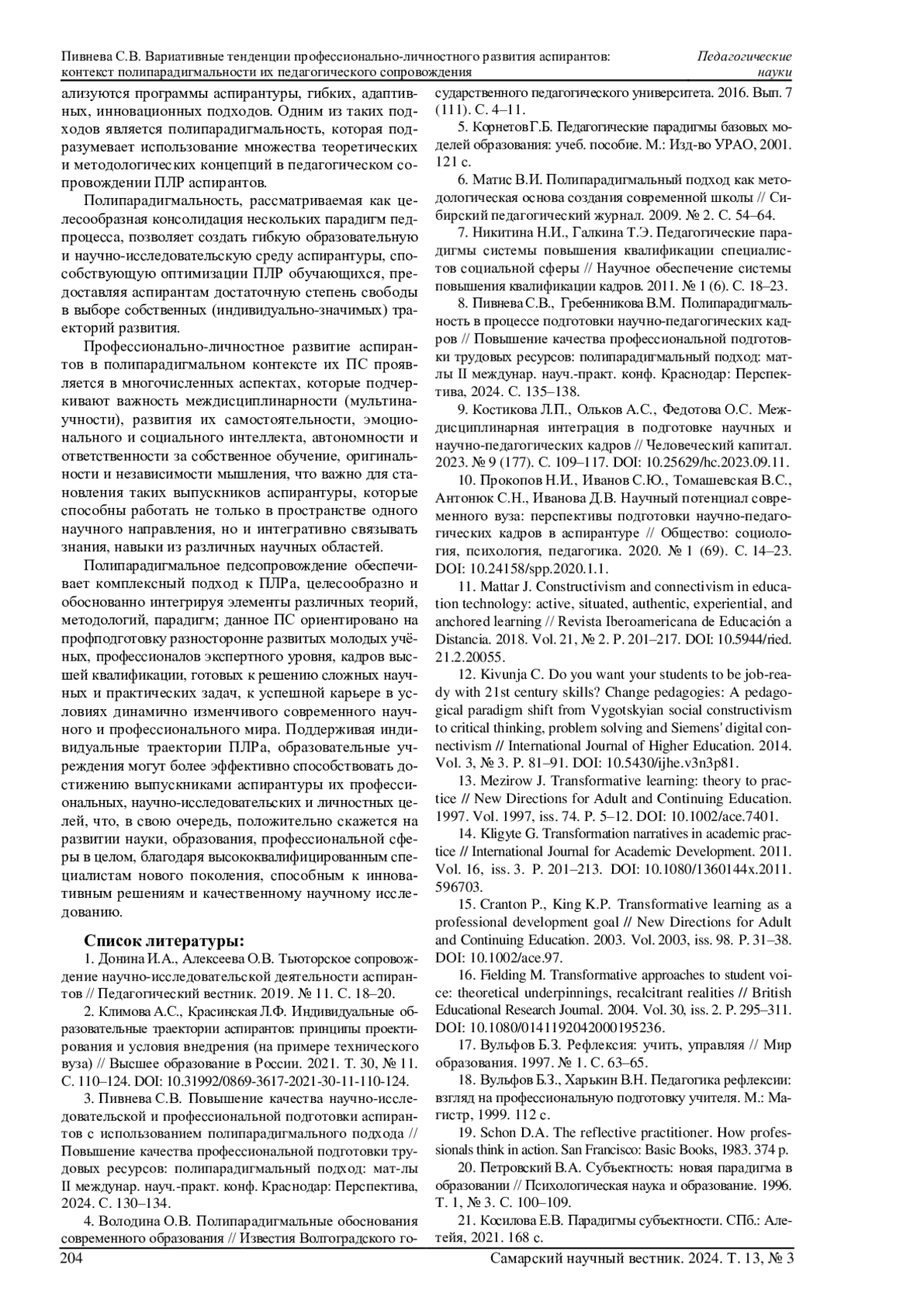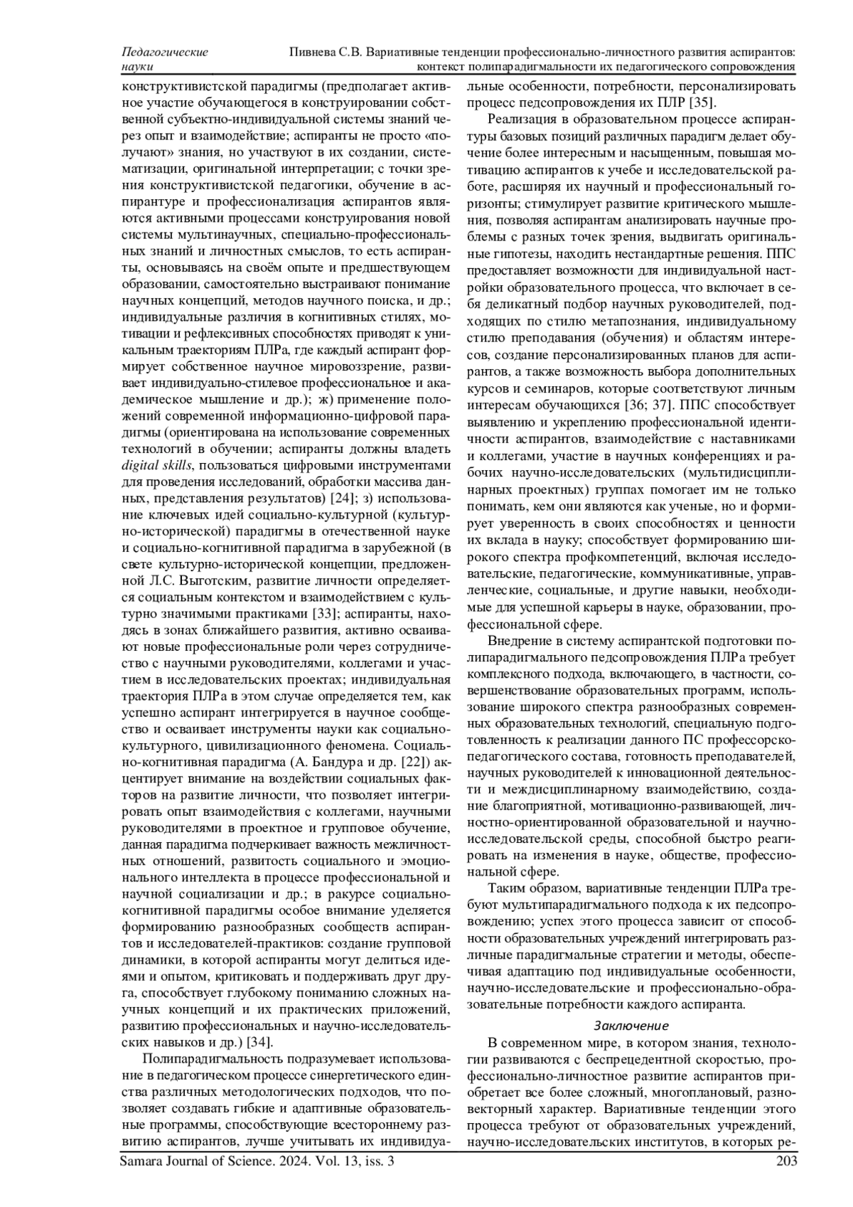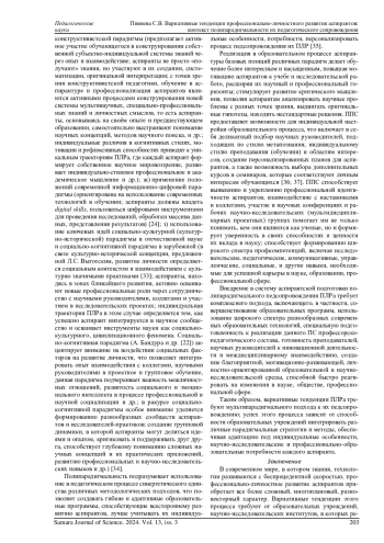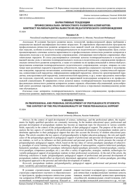 ПИВНЕВА С. В. ВАРИАТИВНЫЕ ТЕНДЕНЦИИ ПРОФЕССИОНАЛЬНО-ЛИЧНОСТНОГО РАЗВИТИЯ АСПИРАНТОВ: КОНТЕКСТ ПОЛИПАРАДИГМАЛЬНОСТИ ИХ ПЕДАГОГИЧЕСКОГО СОПРОВОЖДЕНИЯ // САМАРСКИЙ НАУЧНЫЙ ВЕСТНИК. 2024. ТОМ 13, № 3