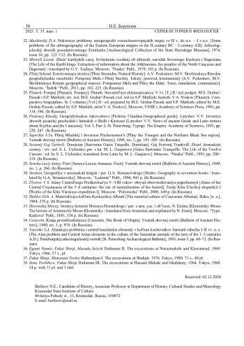 7. Берлизов Н.Е. Походы алан в Закавказье в первые века нашей эры: письменные и археологические свидетельства // Историко-археологический альманах. 1997. Вып. 3. С. 41-54.
