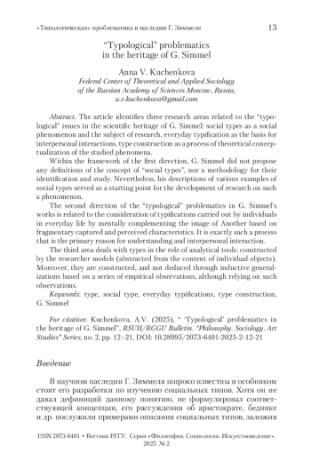 В статье выделены три направления исследований в научном наследии Г. Зиммеля, связанных с «типологической» проблематикой: социальные типы как социальный феномен и предмет исследования, повседневные типизации как основа межличностных взаимодействий, конструирование типов как процесс теоретической концептуализации изучаемых явлений. В рамках первого направления Г. Зиммель не предлагал ни дефиниций «социальных типов», ни методологии их выявления и изучения. Несмотря на это, его описания различных примеров социальных типов послужили основой для развития исследований данного феномена. Второе направление «типологической» проблематики в трудах Г. Зиммеля связано с рассмотрением типизаций, осуществляемых индивидами в повседневной жизни путем мысленного дополнения образа Другого на основе фрагментарно уловленных и воспринятых его характеристик. Именно этот процесс является основной понимания и межличностного взаимодействия. Третье направление посвящено типам в роли аналитических инструментов, моделей, конструируемых исследователем в процессе познания (абстрагированных от содержания отдельных объектов). Причём именно конструируемых, а не выводимых посредством индуктивных обобщений на основе серии эмпирических наблюдений, хотя и опирающихся на таковые.