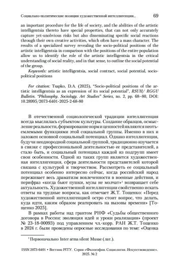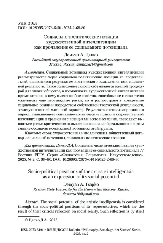 Социальный потенциал художественной интеллигенции рассматривается через социально-политические позиции ее представителей, являющиеся результатом критического осмысления ими социальной реальности. Такое осмысление само по себе является важной процедурой для жизни общества, а возможности художественной интеллигенции применительно к нему имеют особые свойства, способные не только точно улавливать еще неочевидные риски, но и распространять конкретные социальные реакции посредством собственной творческой деятельности, зачастую носящей массовый характер. Результаты специализированного опроса, выявляющего социально-политические позиции художественной интеллигенции в сравнении с позициями всего населения, позволяют выявить ее роль в критическом осмыслении социальной реальности, и в этом смысле обозначить социальной потенциал этой группы.