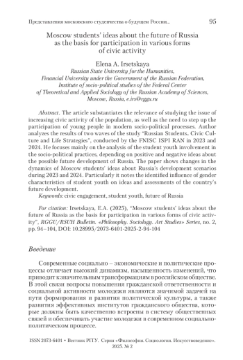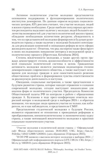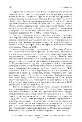 4. Ирсетская, Китайцева 2024 - Ирсетская Е.А., Китайцева О.В. Политические взгляды студенческой молодежи, как основание для участия в различных формах гражданской активности // Вестник РГГУ. Серия «Философия. Социология. Искусствоведение». 2024. № 4. С. 115-125.