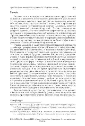 2. Великая, Ирсетская 2024 - Великая Н.М., Ирсетская Е.А. Идеологические основания конструирования образа будущего в сознании современной студенческой молодежи // Вестник Российского университета дружбы народов. Серия: Социология. 2024. Т. 24. № 2. C. 414-429.