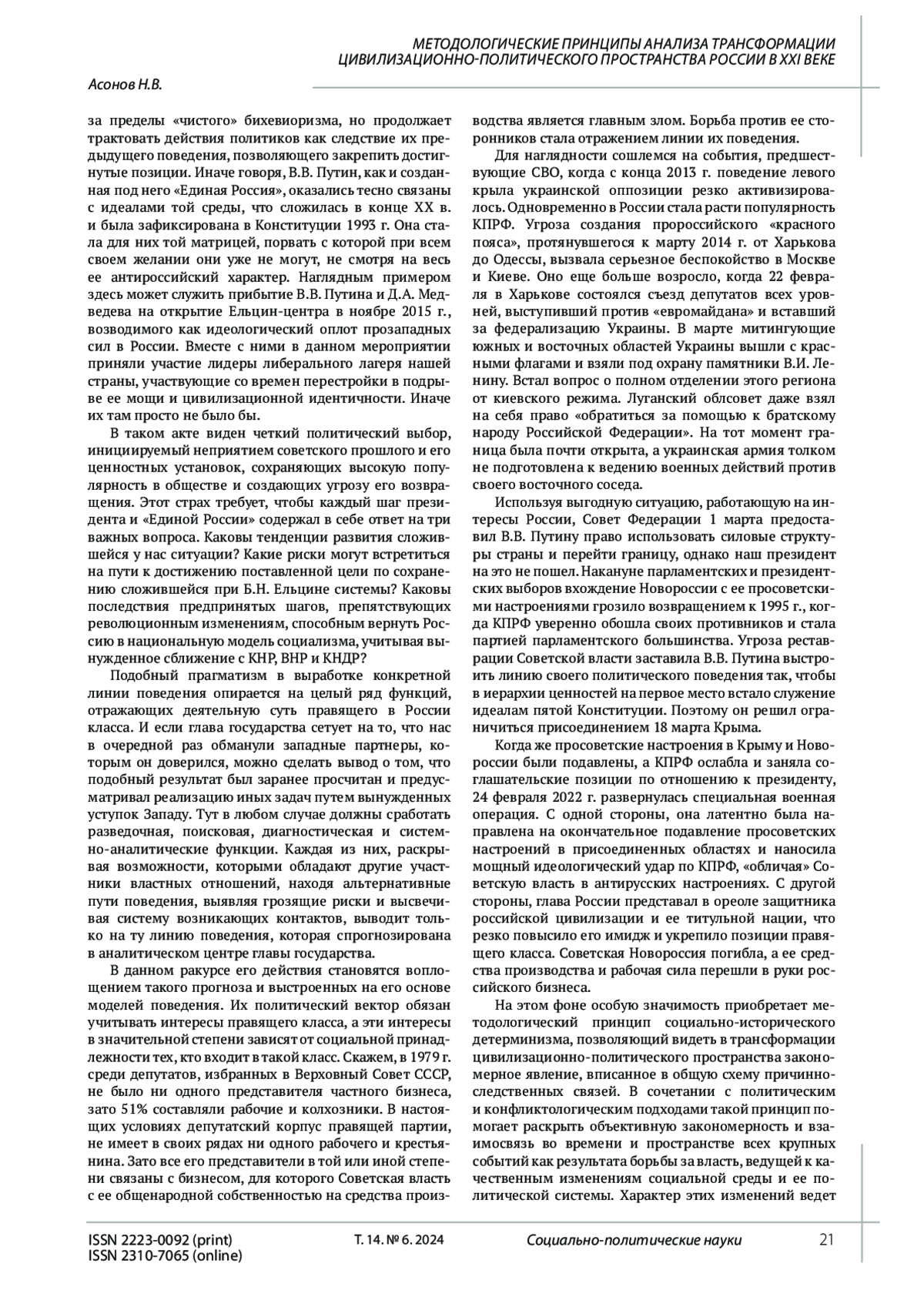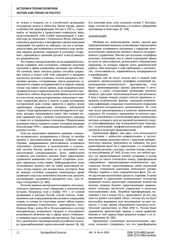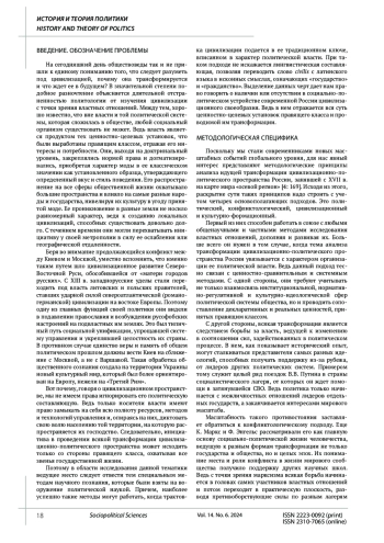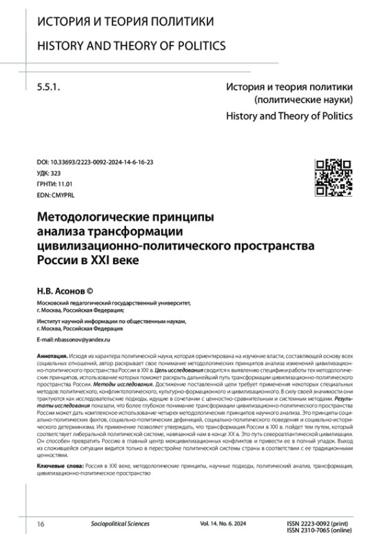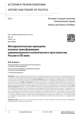 Исходя из характера политической науки, которая ориентирована на изучение власти, составляющей основу всех социальных отношений, автор раскрывает свое понимание методологических принципов анализа изменений цивилизационно-политического пространства России в XXI в. Цель исследования сводится к выявлению специфики работы тех методологических принципов, использование которых поможет раскрыть дальнейший путь трансформации цивилизационно-политического пространства России. Методы исследования. Достижение поставленной цели требует применения некоторых специальных методов: политического, конфликтологического, культурно-формационного и цивилизационного. В силу своей значимости они трактуются как исследовательские подходы, идущие в сочетании с ценностно-сравнительным и системным методами. Результаты исследования показали, что более глубокое понимание трансформации цивилизационно-политического пространства России может дать комплексное использование четырех методологических принципов научного анализа. Это принципы социально-политических фактов, социально-политических дефиниций, социально-политического поведения и социально-исторического детерминизма. Их применение позволяет утверждать, что трансформация России в XXI в. пойдет тем путем, который соответствует либеральной политической системе, навязанной нам в конце ХХ в. Это путь североатлантической цивилизации. Он способен превратить Россию в главный центр межцивилизационных конфликтов и привести ее в полный упадок. Выход из сложившейся ситуации видится только в перестройке политической системы страны в соответствии с ее традиционными ценностями.