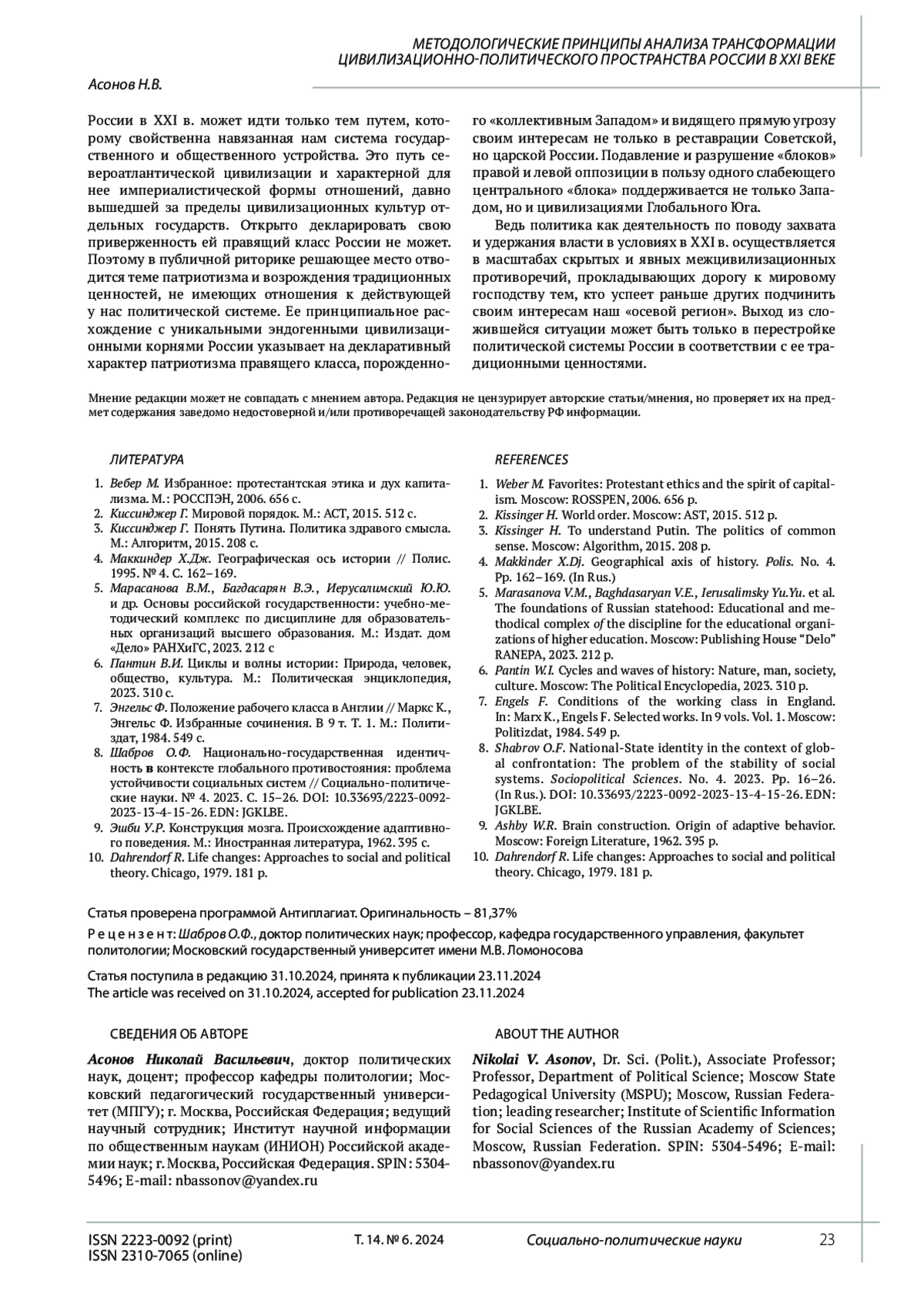 8. Шабров О.Ф. Национально-государственная идентичность в контексте глобального противостояния: проблема устойчивости социальных систем // Социально-политические науки. № 4. 2023. С. 15-26. DOI: 10.33693/2223-0092-2023-13-4-15-26 EDN: JGKLBE