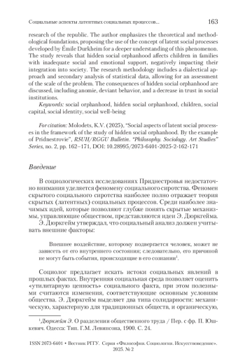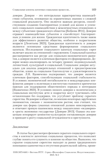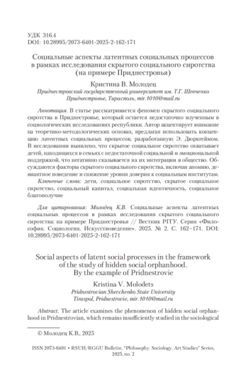 В статье рассматривается феномен скрытого социального сиротства в Приднестровье, который остается недостаточно изученным в социологических исследованиях республики. Автор акцентирует внимание на теоретико-методологических основах, предлагая использовать концепцию латентных социальных процессов, разработанную Э. Дюркгеймом. В исследовании выявлено, что скрытое социальное сиротство охватывает детей, находящихся в семьях с недостаточной социальной и эмоциональной поддержкой, что негативно сказывается на их интеграции в общество. Обсуждаются факторы скрытого социального сиротства, включая аномию, девиантное поведение и снижение уровня доверия к социальным институтам.