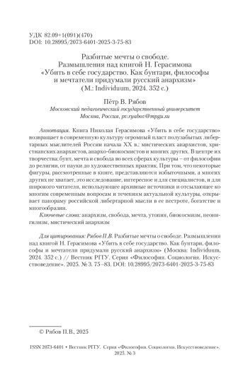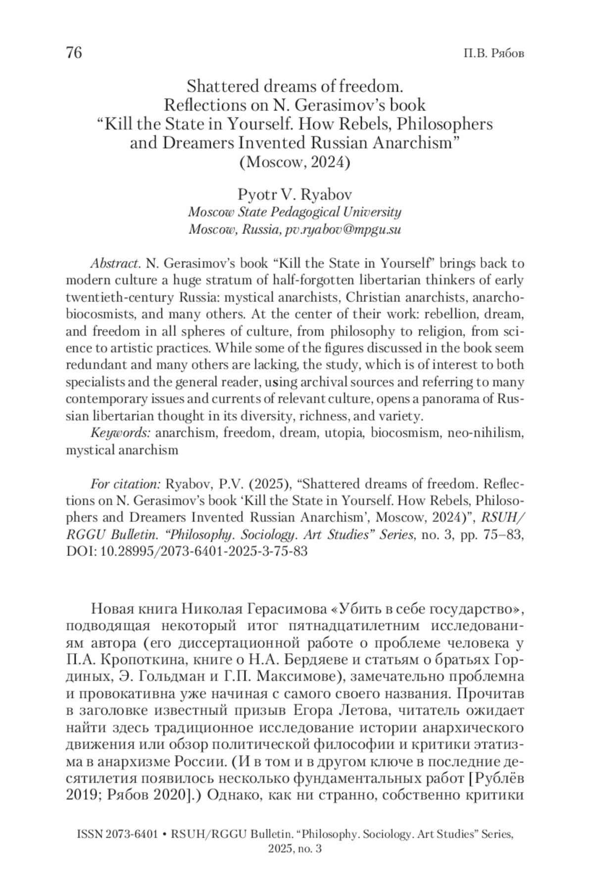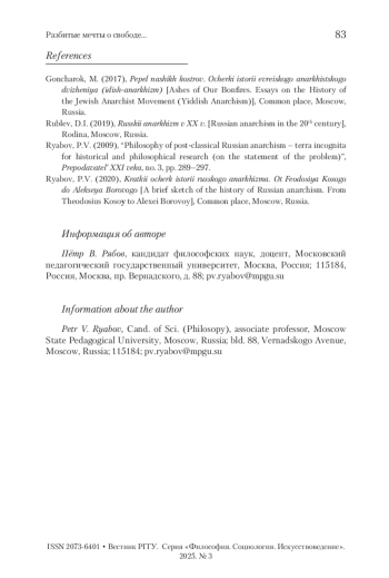 3. Рябов 2009 - Рябов П.В. Философия постклассического российского анархизма - terra incognita для историко-философских исследований (к постановке проблемы) // Преподаватель XXI века. 2009. № 3. С. 289-297.