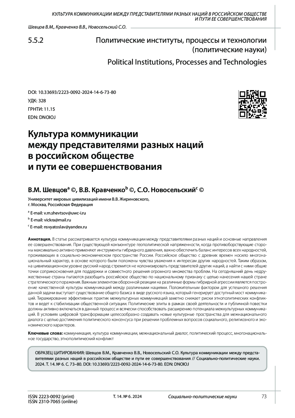В статье рассматривается культура коммуникации между представителями разных наций и основные направления ее совершенствования. При существующей конъюнктуре геополитической напряженности, когда противоборствующие стороны максимально активно применяют инструменты гибридного давления, важно обеспечить баланс интересов всех народностей, проживающих в социально-экономическом пространстве России. Российское общество с древних времен носило многонациональный характер, в основе которого были положены чувства уважения к интересам других народностей. Таким образом, на цивилизационном уровне русский народ стремится не колонизировать представителей других наций, а найти с ними общие точки соприкосновения для поддержки и совместного решения огромного множества проблем. На сегодняшний день недружественные страны пытаются разобщить российское общество по национальному признаку с целью нанесения нашей стране стратегического поражения. Важным элементом оборонной реакции на различные формы гибридной агрессии является построение качественной культуры коммуникаций между различными нациями. Положительным фактором для успешного решения данной задачи выступает существование общего базиса в виде русского языка, который генерирует доступный мост коммуникаций. Тиражирование эффективных практик межкультурных коммуникаций заметно снижает риски этнополитических конфликтов и ведет к стабилизации общественной ситуации. Политические элиты в рамках своей деятельности и публичной повестки должны активно включаться в данный процесс и всячески способствовать расширению потенциала межкультурных коммуникаций. В условиях цифровой трансформации целесообразно создавать новые культурные пространства для межнационального диалога с целью достижения политического консенсуса при решении проблемных вопросов социального, религиозного и экономического характеров.