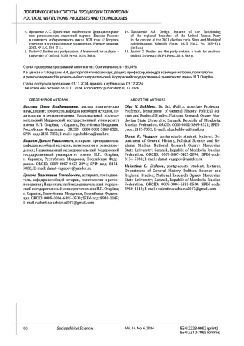 Yaroshenko A.S. Design features of the functioning of the regional branches of the United Russia Party in the context of the 2021 election cycle. State and Municipal Administration. Scientific Notes. 2023. No.2. Pp. 305-311. (In Rus.). EDN: PNEJDY