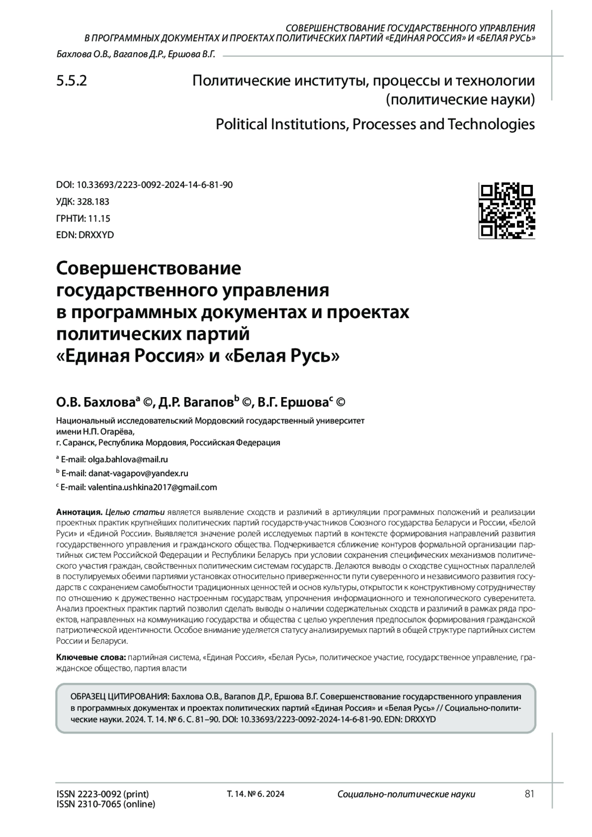 2. Батанина И.А., Лаврикова А.А. Образ будущего страны в партийном дискрусе // Известия Тульского государственного университета. Гуманитарные науки. 2024. Вып. 1. С. 3-11. EDN: APXSUM
