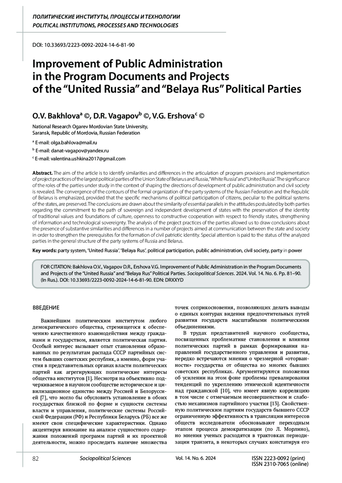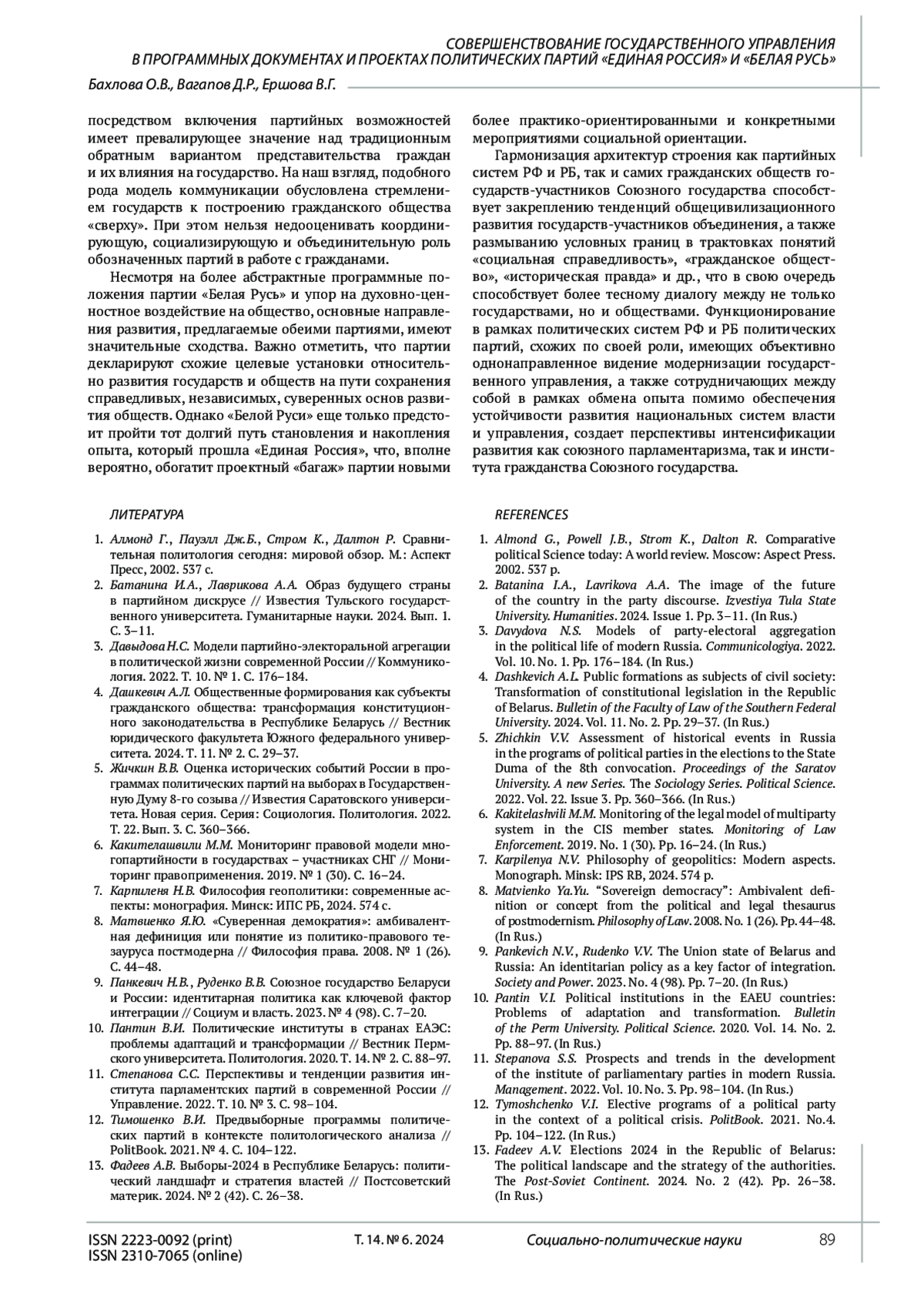 Целью статьи является выявление сходств и различий в артикуляции программных положений и реализации проектных практик крупнейших политических партий государств-участников Союзного государства Беларуси и России, «Белой Руси» и «Единой России». Выявляется значение ролей исследуемых партий в контексте формирования направлений развития государственного управления и гражданского общества. Подчеркивается сближение контуров формальной организации партийных систем Российской Федерации и Республики Беларусь при условии сохранения специфических механизмов политического участия граждан, свойственных политическим системам государств. Делаются выводы о сходстве сущностных параллелей в постулируемых обеими партиями установках относительно приверженности пути суверенного и независимого развития государств с сохранением самобытности традиционных ценностей и основ культуры, открытости к конструктивному сотрудничеству по отношению к дружественно настроенным государствам, упрочнения информационного и технологического суверенитета. Анализ проектных практик партий позволил сделать выводы о наличии содержательных сходств и различий в рамках ряда проектов, направленных на коммуникацию государства и общества с целью укрепления предпосылок формирования гражданской патриотической идентичности. Особое внимание уделяется статусу анализируемых партий в общей структуре партийных систем России и Беларуси.